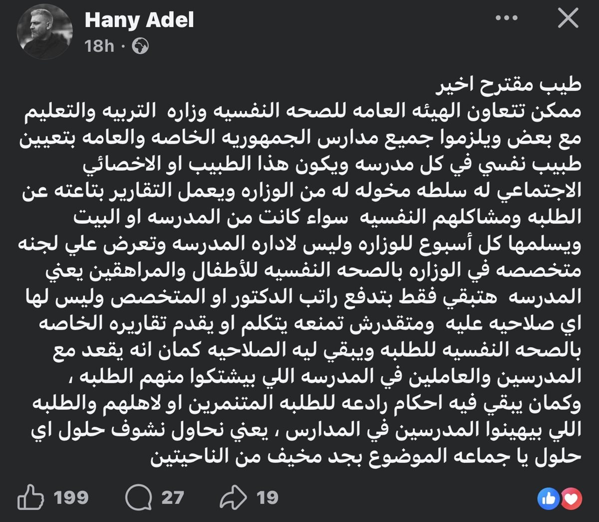 قال هاني عادل: “طيب مقترح اخير .. ممكن تتعاون الهيئه العامه للصحه النفسيه وزاره التربيه والتعليم مع بعض ويلزموا جميع مدارس الجمهوريه الخاصه والعامه بتعيين طبيب نفسي في كل مدرسه ويكون هذا الطبيب او الاخصائي الاجتماعي له سلطه مخوله له من الوزاره”.