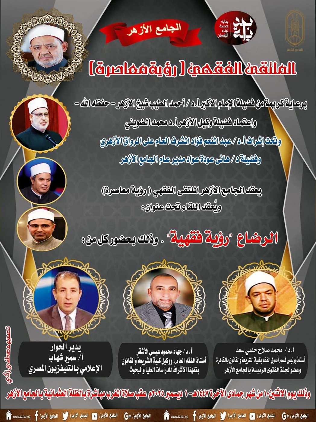 يعقد غدًا الجامع الأزهر الملتقى الفقهي بين الشرع والطب الثامن والثلاثون بعنوان "رؤية معاصرة"، والذي يناقش على مائدته: الرضاع "رؤية فقهية".
