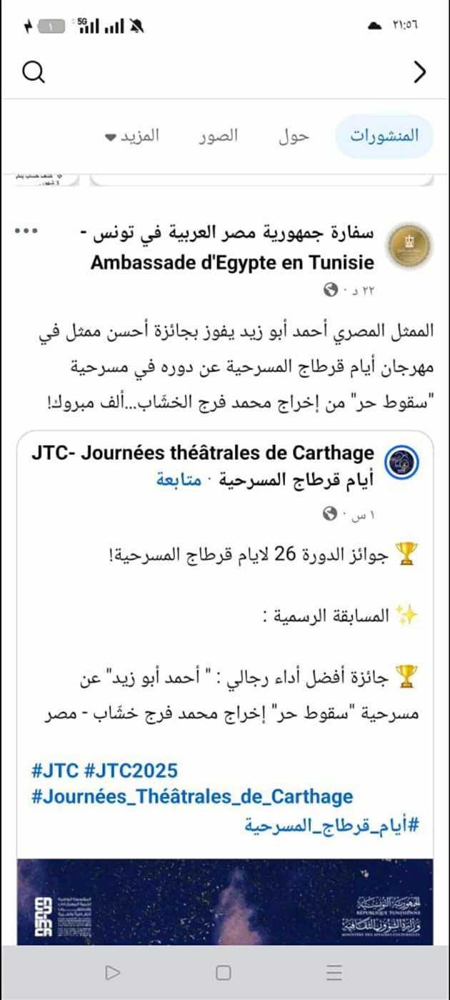 سفارة مصر في تونس تحتفي بأحمد أبو زيد وجائزة أفضل ممثل في مهرجان قرطاج