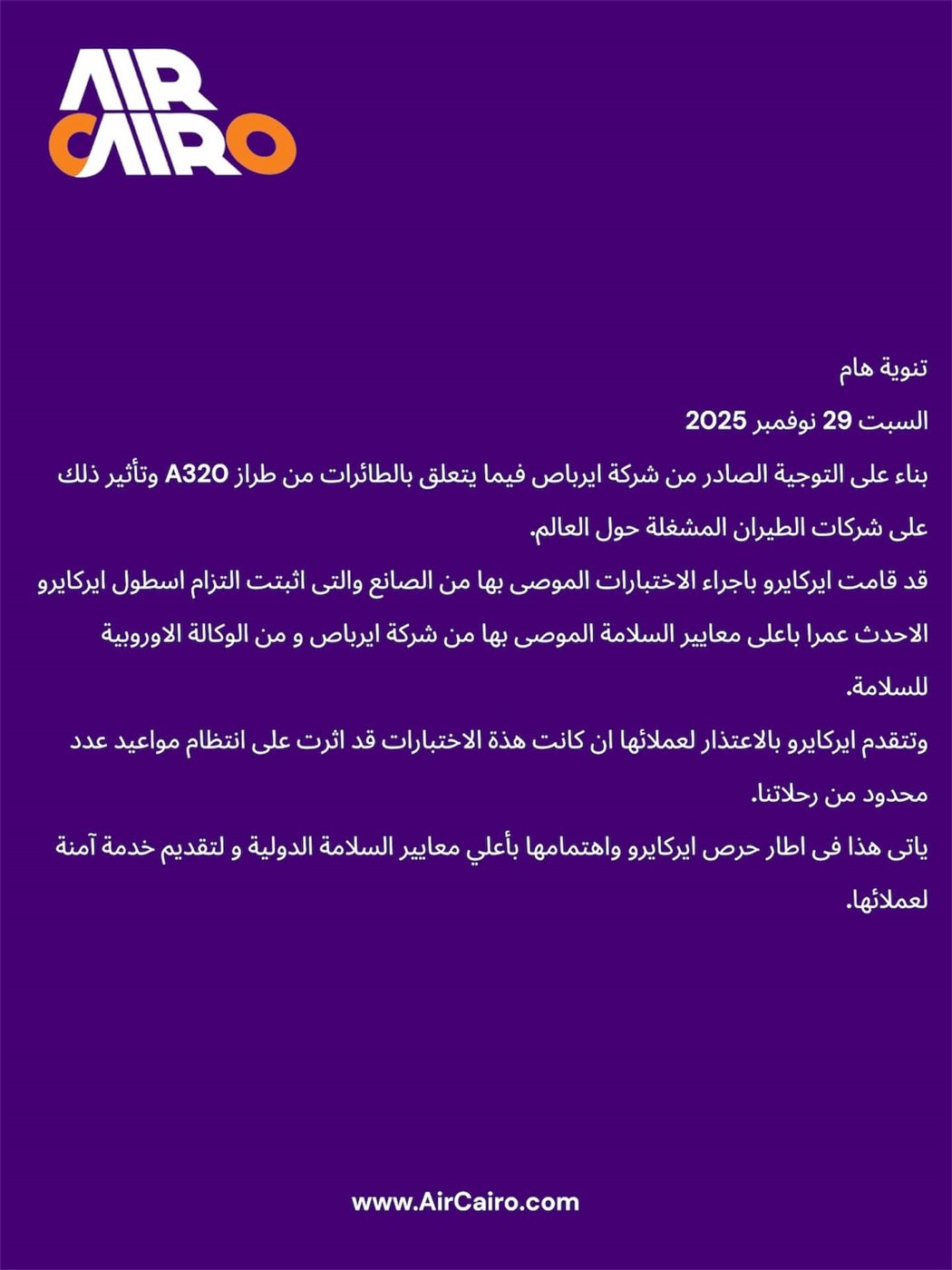 وأضافت «إيركايرو» أنها تعتذر لعملائها عن أي تأثر محدود قد يكون طرأ على انتظام مواعيد عدد قليل من الرحلات، نتيجة لإجراء هذه الاختبارات الاحترازية، مشددة على أن تلك الخطوة تأتي في إطار حرصها الدائم على تقديم خدمة آمنة وموثوقة، ووضع سلامة الركاب وأطقم الطيران على رأس أولوياتها.