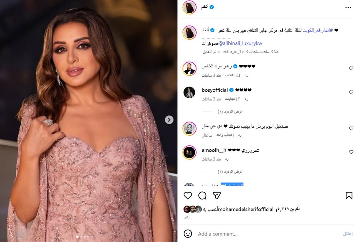 ونشرت أنغام الصور عبر حسابها الرسمي على موقع "إنستجرام"، وعلّقت: "الليلة الثانية في مركز جابر الثقافي مهرجان ليلة عمر".