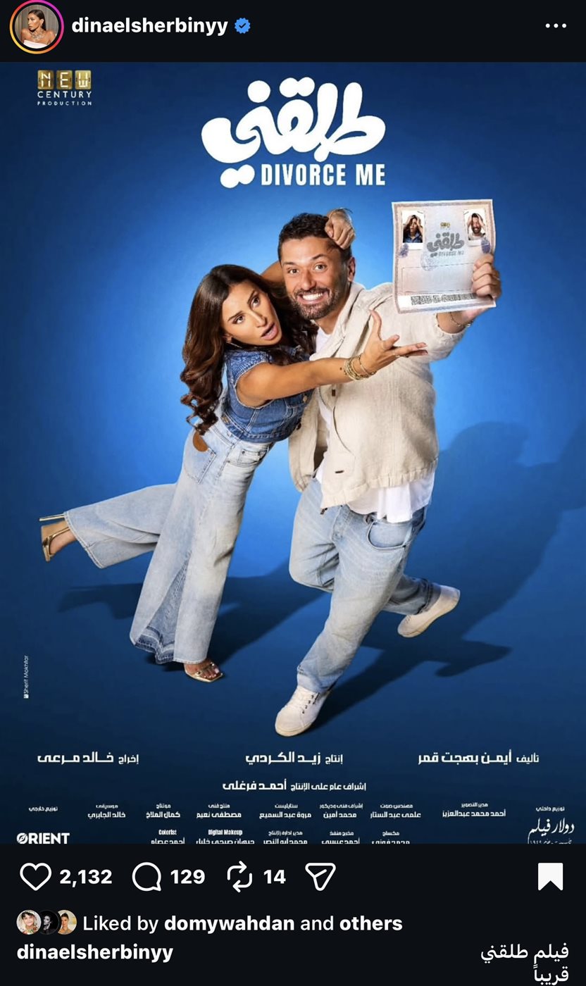 ظهرت دينا الشربيني في البوستر وهي تمسك بكريم عبد العزيز وهو يمسك في يده قسيمة طلاق وتحاول الحصول عليها منه، وعلقت عليه قائلة: “فيلم طلقني قريبًا”.