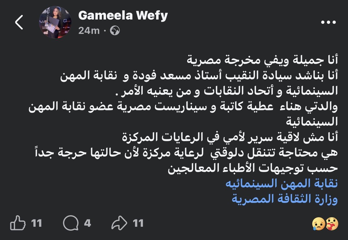 ناشدت المخرجة جميلة ويفي، وزارة الثقافة، ونقيب السينمائيين مسعد فودة ونقابة المهن السينمائية وأتحاد النقابات لمحاولة مساعدتها في إيجاد سرير لوالدتها في الرعاية المركزة، وذلك خلال منشور عبر حسابها الشخصي بموقع التواصل الإجتماعي الأشهر “فيس بوك”.
