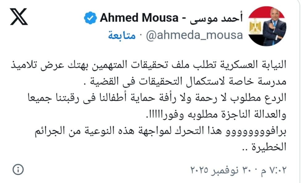 أشاد الإعلامي أحمد موسى بتحرك النيابة العسكرية وطلبها ملف تحقيقات المتهمين بهتك عرض تلاميذ مدرسة سيدز الدولية لاستكمال تحقيقات القضية، وذلك خلال تغريدة عبر حسابه الشخصي بمنصة التغريدات المصغرة “إكس”.