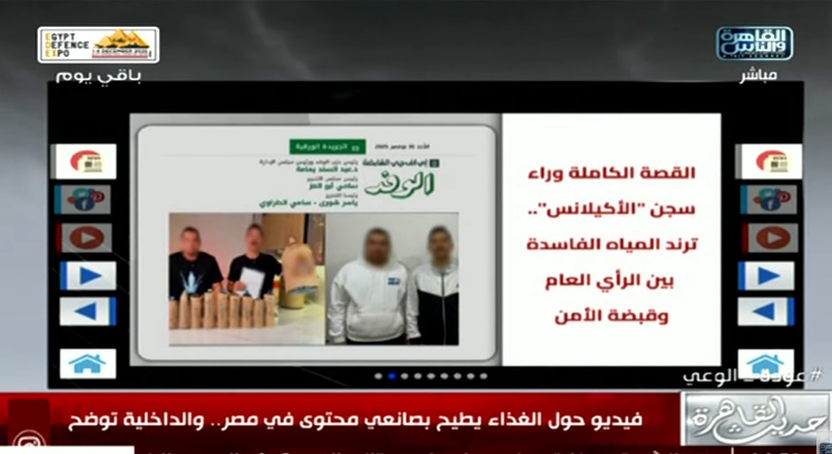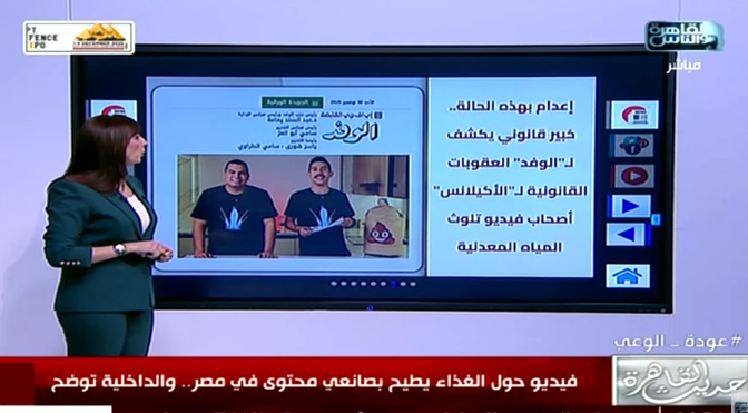 أبرز برنامج "حديث القاهرة"، تقديم الإعلامية كريمة عوض عبر شاشة "القاهرة والناس"، ما نشرته بوابة الوفد بشأن فيديو تلوث المياه المعدنية الذي نشره صناع المحتوى المعروفون باسم "الأكيلانس"، في خبر بعنوان: "إعدام بهذه الحالة.. خبير قانوني يكشف لـ'الوفد' العقوبات القانونية لـ'الأكيلانس'".