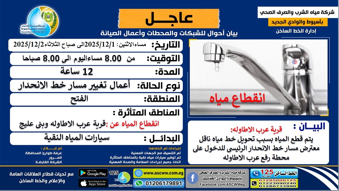 أعلنت شركة مياه الشرب والصرف الصحي بأسيوط والوادي الجديد أن انقطاع مياه الشرب عن قريتي عرب الأطاولة وبني عليج سيبدأ اليوم الاثنين الموافق 1 ديسمبر الجاري ابتداء من الساعة الثامنة مساء وحتى الساعة الثامنة صباح يوم الثلاثاء 2 ديسمبر 2025 ولمدة 12 ساعة وذلك بسبب تنفيذ أعمال تحويل خط ناقل قطر 355 مم يتعارض مع مسار خط الانحدار الرئيسي قطر 900 مم المتجه إلى محطة رفع عرب الأطاولة بمركز الفتح
