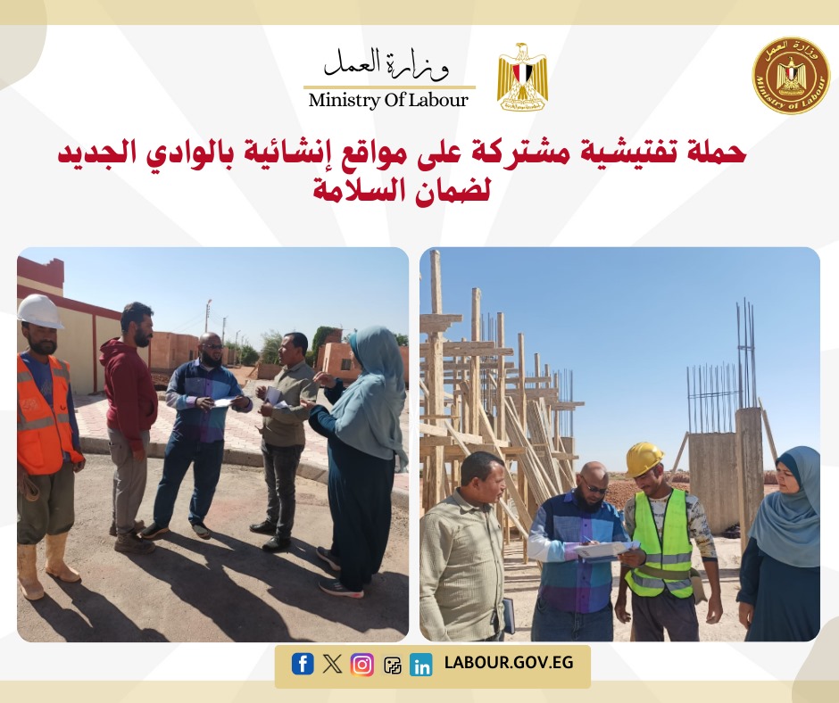 أجرى مكتب التفتيش العمالي بمركز بلاط ومكتب السلامة والصحة المهنية بمركز الخارجة، التابعين لمديرية العمل بالوادي الجديد، حملة تفتيشية على مواقع إنشائية بدائرة مكتب عمل بلاط، وذلك تنفيذاً لتوجيهات وزير العمل بتكثيف حملات التفتيش على المنشآت تحت الإنشاء وتطبيق أحكام قانون العمل الجديد رقم 14 لسنة 2025.