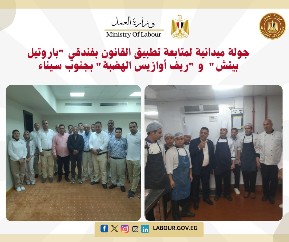 كما قاد أكرم محمد سيد أحمد، مدير مديرية العمل بجنوب سيناء، جولة ميدانية بمدينة شرم الشيخ شملت فندق باروتيل بيتش، وفندق ريف أوازيس الهضبة.
