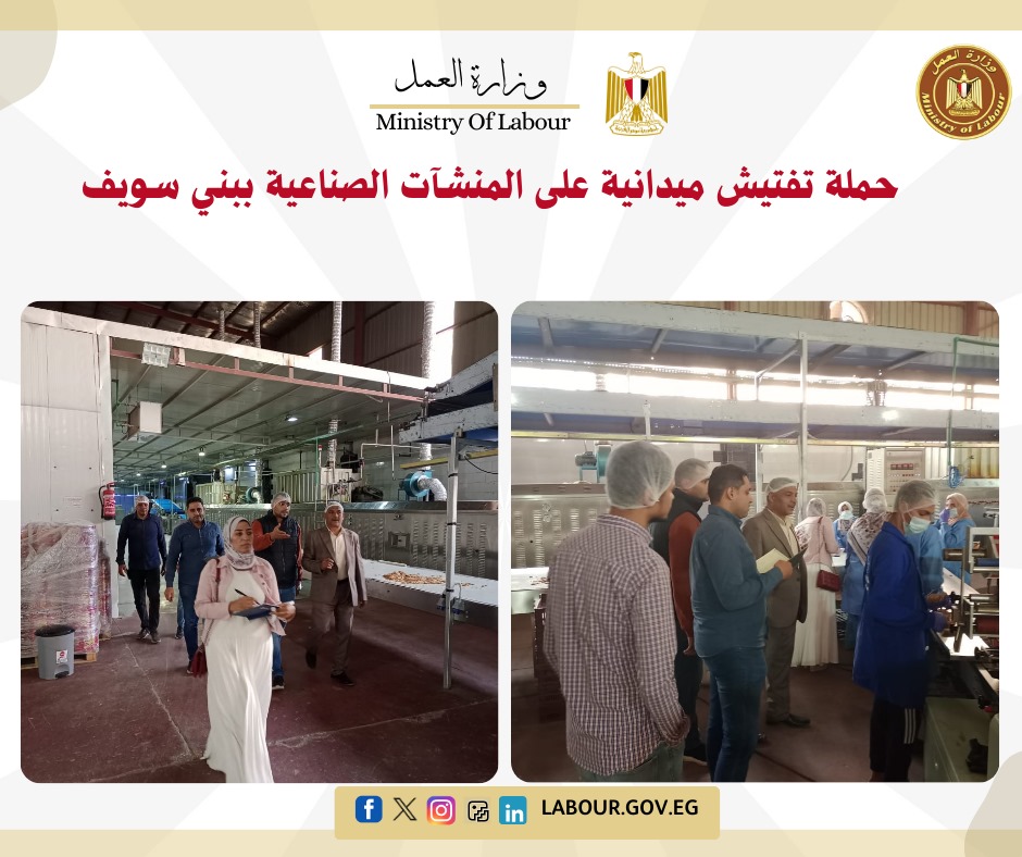 وفي سياق آخر، قامت مديرية العمل ببني سويف، بحملة تفتيشية ميدانية على عدد من المنشآت الصناعية بمنطقة بياض العرب شرق النيل.