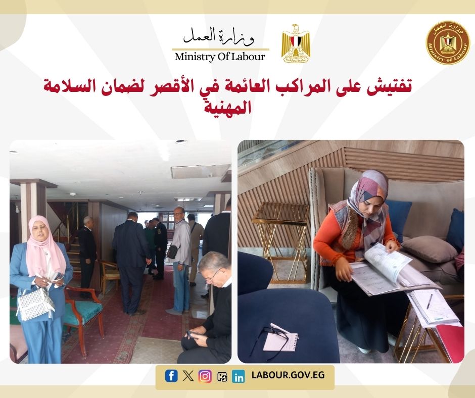 وأيضًا شاركت مديرية عمل الأقصر، ممثلة في مكتب السلامة والصحة المهنية، في لجنة تفتيشية مشتركة مع شرطة المسطحات المائية وممثلي وزارتي السياحة والبيئة، على عدد (10) من المراكب العائمة.