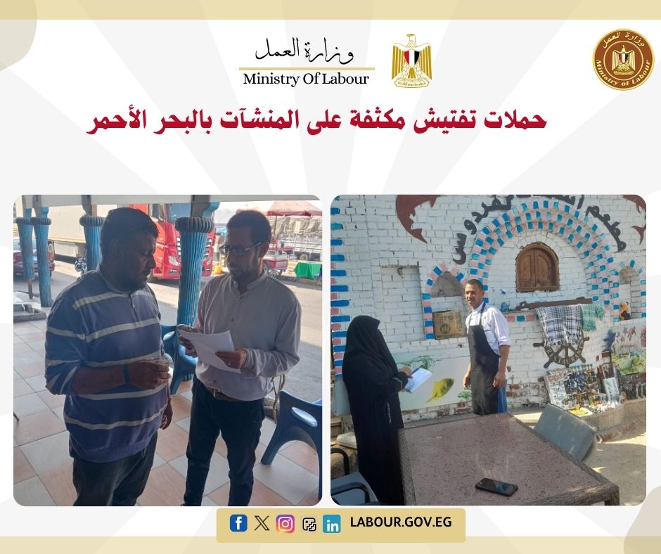 وقامت مديرية العمل بالبحر الأحمر، بتنفيذ حملات تفتيشية مكثفة على المنشآت بنطاق المحافظة، تنفيذاً لتوجيهات وزير العمل محمد جبران.