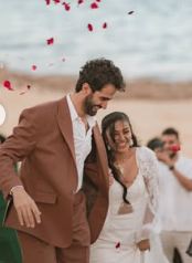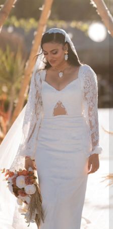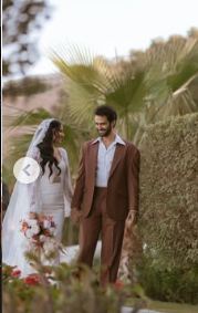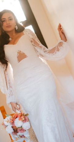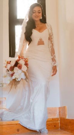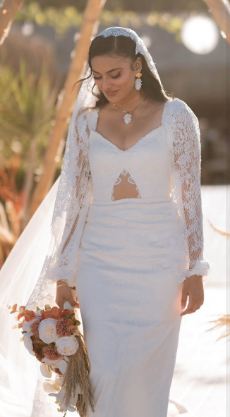 ومن الناحية الجمالية، اعتمدت تسريحة شعر جذابة وزينت خصلات شعرها بطرحة زفاف طويل مزينه بالدانتيل لتتناغم مع قصة الفستان ووضعت مكياجًا ناعمًا مرتكزًا على الألوان الترابية مع تحديد عينيها بالكحل والماسكرا السوداء ولون الكشمير في الشفاه.