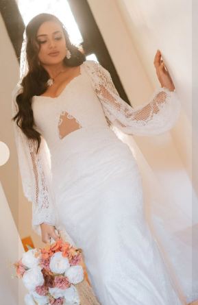 وبدت ثراء جبيل بإطلالة ساحرة، مرتدية فستان زفاف طويل مجسم، صمم من الجوبير والدانتيل باللون الأبيض الفستان عكس قوامهم الممشوق ووزنهم المثالي.