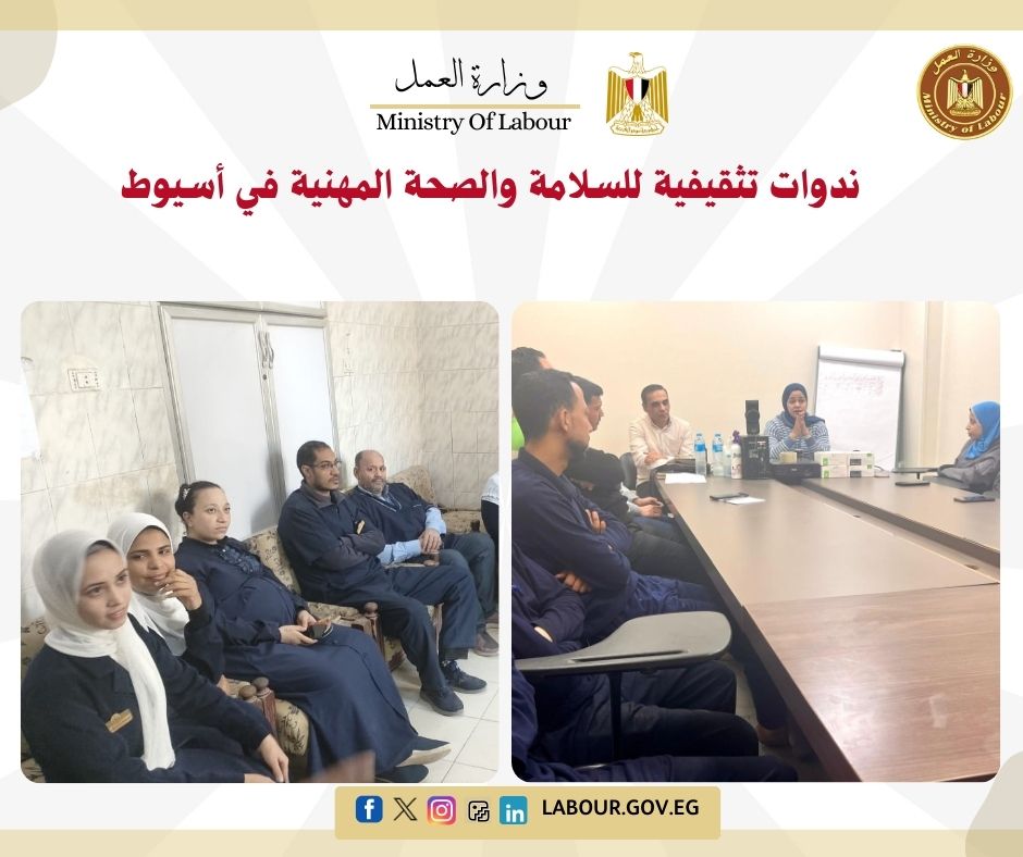 نظمت مديرية عمل أسيوط مجموعة من الندوات التثقيفية حول السلامة والصحة المهنية في عدة منشآت، منها الشركة الدولية للمستلزمات الطبية (مصنع السرنجات) ومستشفى البداري المركزي.