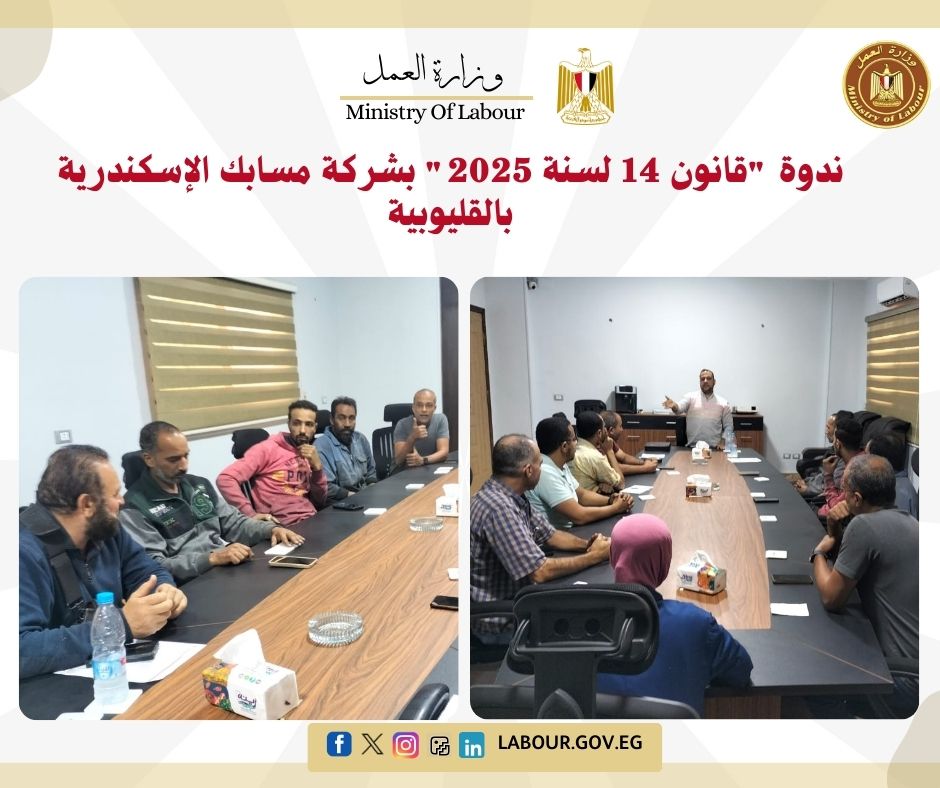 وفي السياق ذاته، عقدت مديرية العمل بالقليوبية ندوة تثقيفية بعنوان "قانون 14 لسنة 2025" بشركة مسابك الإسكندرية لعدد (12) عاملاً.