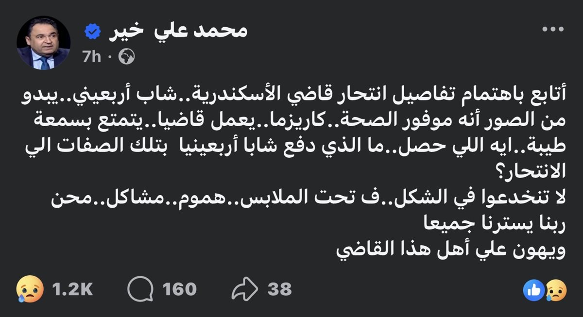كتب محمد علي خير: “أتابع باهتمام تفاصيل انتحار قاضي الإسكندرية.. شاب أربعيني.. يبدو من الصور أنه موفور الصحة.. كاريزما.. يعمل قاضيا.. يتمتع بسمعة طيبة..ايه اللي حصل..ما الذي دفع شابا أربعينيا بتلك الصفات إلي الانتحار؟”.
