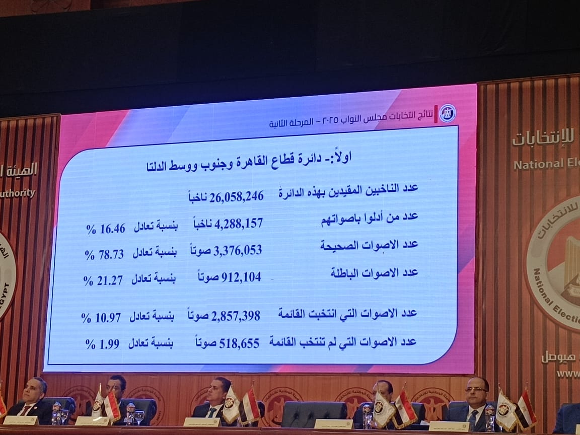 أعلن المستشار حازم بدوي، رئيس الهيئة الوطنية للانتخابات، نتيجة القائمة بدائرة قطاع القاهرة وجنوب ووسط الدلتا، وذلك في المرحلة الثانية من انتخابات مجلس النواب 2025.