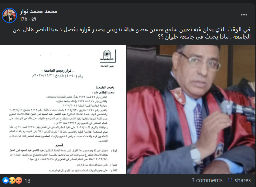 يكشف المستند المتداول الذي نشره في البداية شخص يُدعى محمد محمد نوار، وفجر من خلاله الأزمة الحالية، أن قرار رئيس جامعة حلوان بفصل الدكتور عبد الناصر هلال، نص على إنهاء خدمته اعتبارا من تاريخ قديم وهو 1 سبتمبر 2022، وذلك بسبب انقطاعه عن العمل.