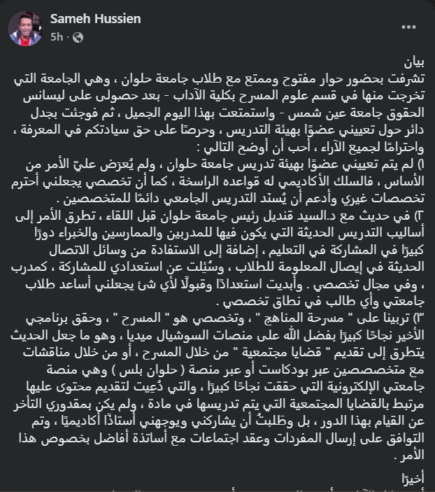 جامعة حلوان تكشف حقيقة تعيين الفنان سامح حسين عضوًا بهيئة التدريس