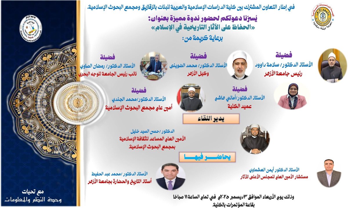 والدكتور محمد الضويني وكيل الأزهر، والدكتور سلامة داود رئيس جامعة الأزهر، والدكتور محمد الجندي الأمين العام لمجمع البحوث الإسلامية، والدكتور رمضان الصاوي نائب رئيس الجامعة للوجه البحري، والدكتور أماني هاشم عميد الكلية.