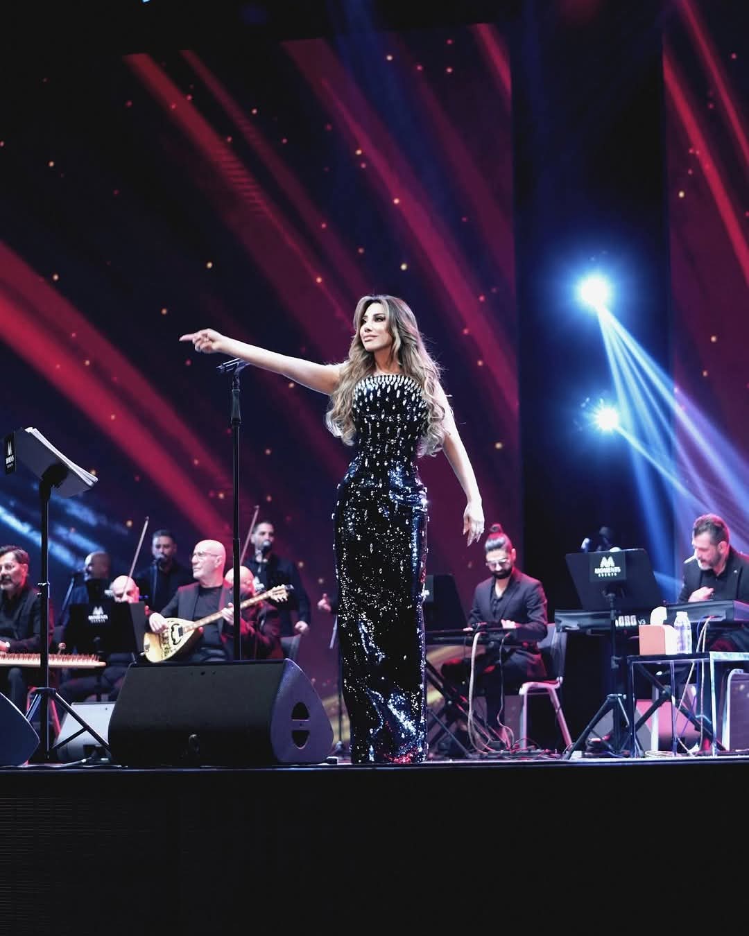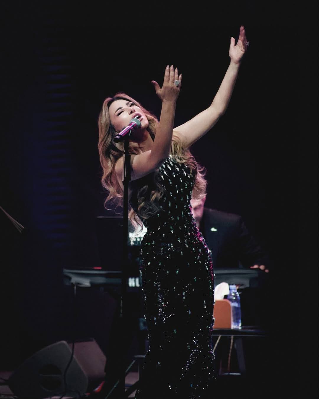 وبدت نجوى كرم بإطلالة ساحرة، مرتديه فستان طويل مجسم ينتمي لقصة الكب صمم من قماش ناعم باللون الأسود وزين بحبيبات الكريستال الفضي بأكمله وعكس الفستان قوامها الرشيق ووزنها المثالي بشكل ناعم.