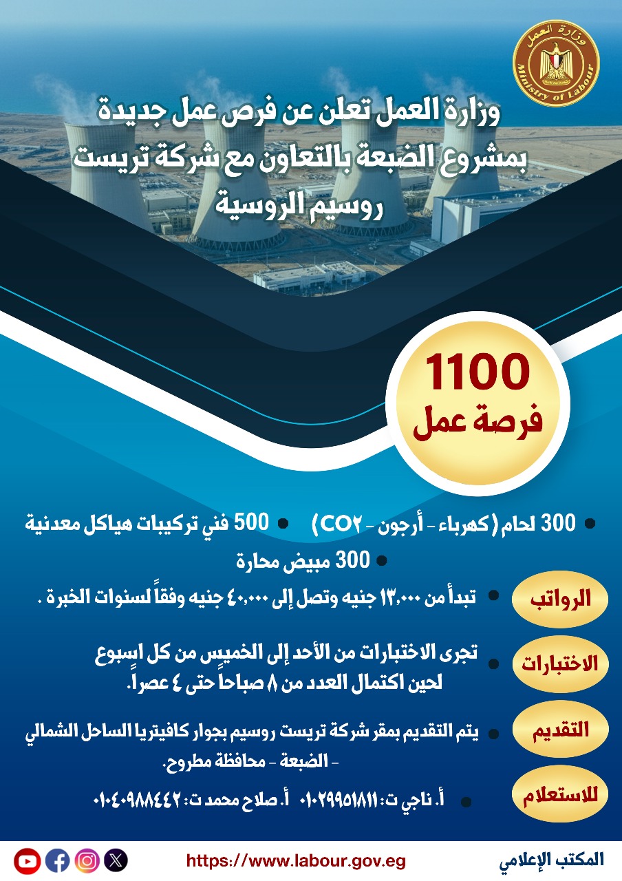 أعلنت وزارة العمل، في إطار توجيهات الوزير محمد جبران بتوفير فرص عمل لائقة للشباب ورفع معدلات التشغيل بالمشروعات القومية، عن إتاحة مجموعة من الوظائف الفنية الجديدة بالتعاون مع شركة تريست روسيم، إحدى الشركات المنفذة لأعمال الإنشاءات داخل محطة الضبعة النووية.