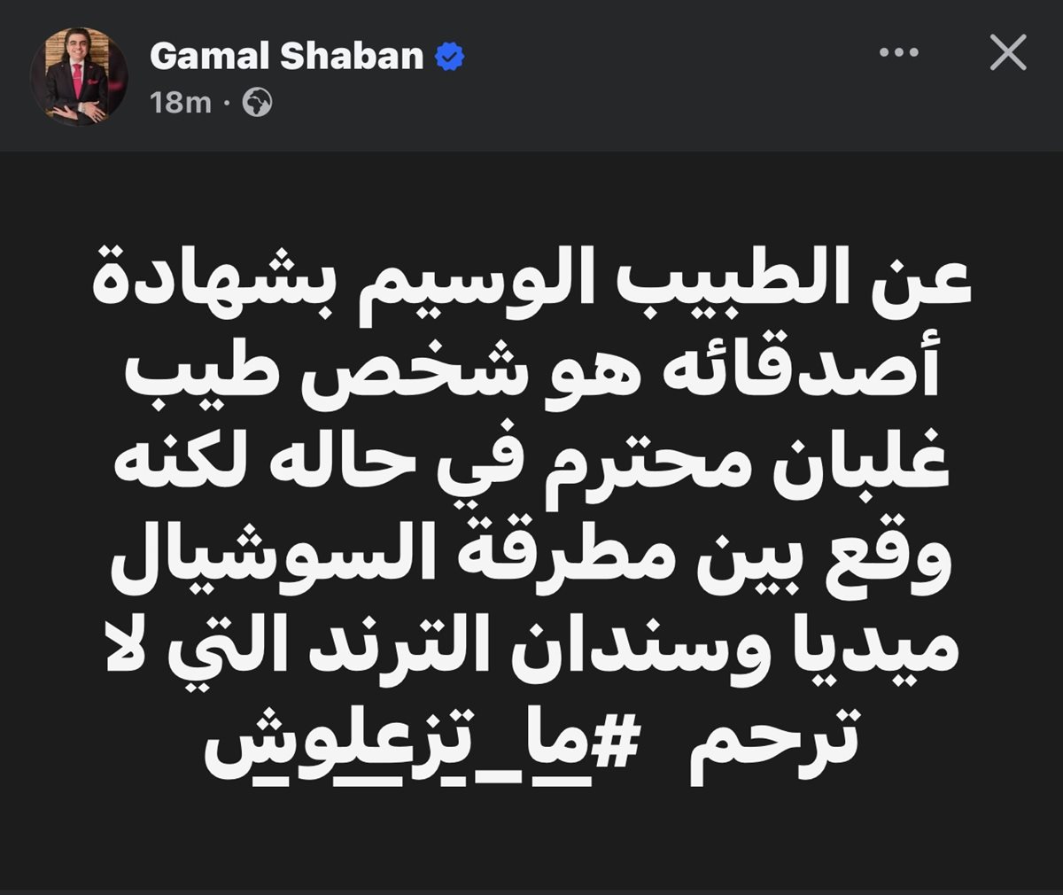 كتب جمال شعبان عبر حسابه الشخصي بموقع التواصل الإجتماعي الأشهر “فيسبوك”: “الطبيب الوسيم بشهادة أصدقائه هو شخص طيب غلبان محترم في حاله”.