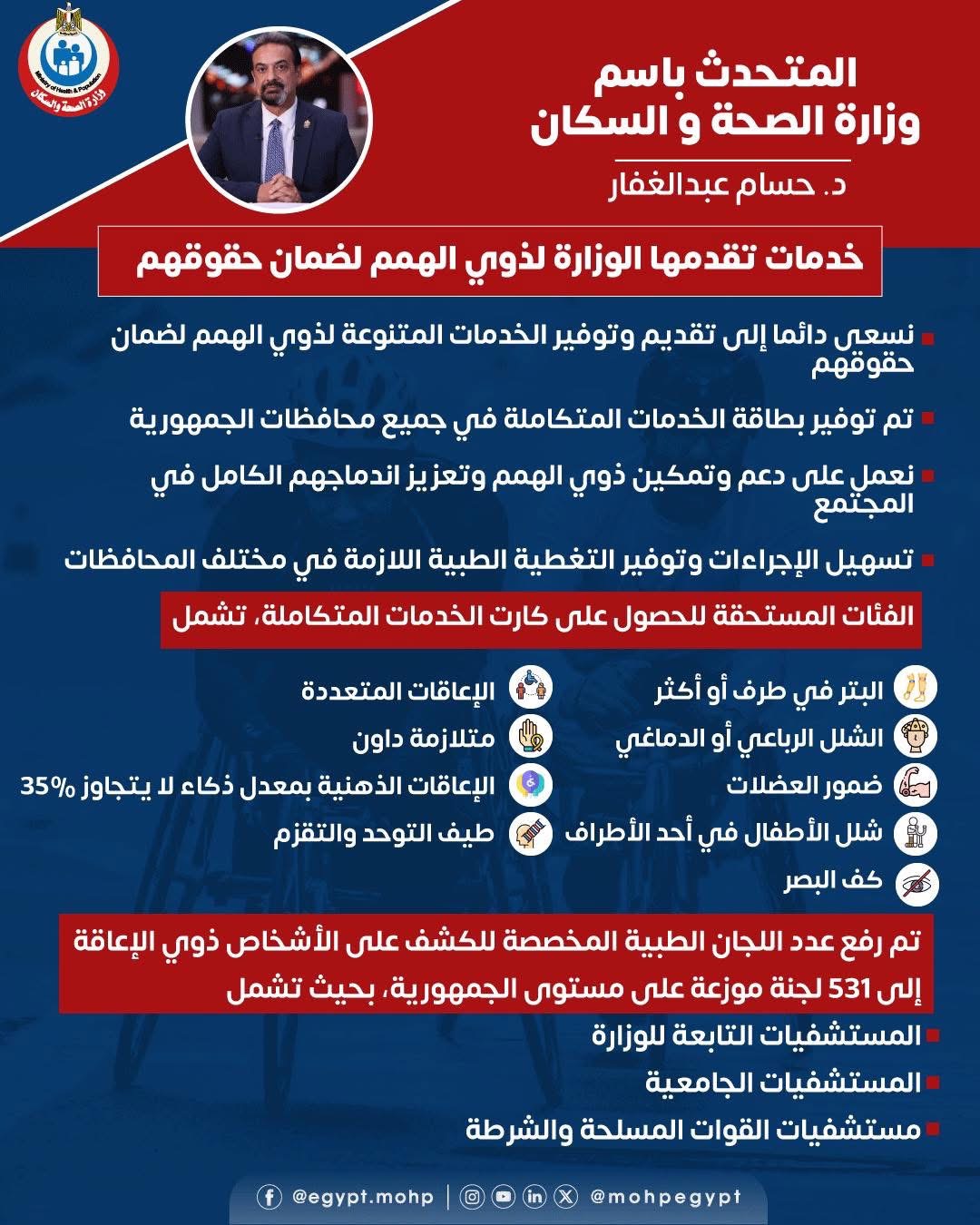 تزامنًا مع اليوم العالمي للأشخاص ذوي الإعاقة، كشف الدكتور حسام عبد الغفار المتحدث الرسمي باسم وزارة الصحة والسكان عن الخدمات التي تقدمها الوزارة لذوي الهمم لضمان حقوقهم، وذلك عبر الصفحة الرسمية بموقع التواصل الإجتماعي الأشهر “فيس بوك”.
