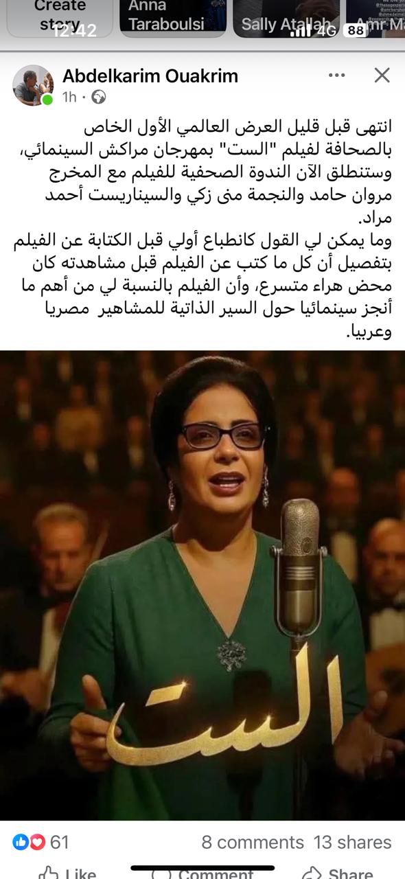 أشاد الناقد السينمائي والكاتب الصحفي المغربي عبد الكريم واكريم، رئيس تحرير مجلة سنفيليا السينمائية المتخصصة، بفيلم الست بطولة النجمة منى زكي، عقب عرضه الخاص للصحفيين الذي أقيم فى المهرجان الدولي للفيلم بمراكش، في دورته الـ 22، وذلك قبل عرضه العالمي الأول للجمهور مساء اليوم.