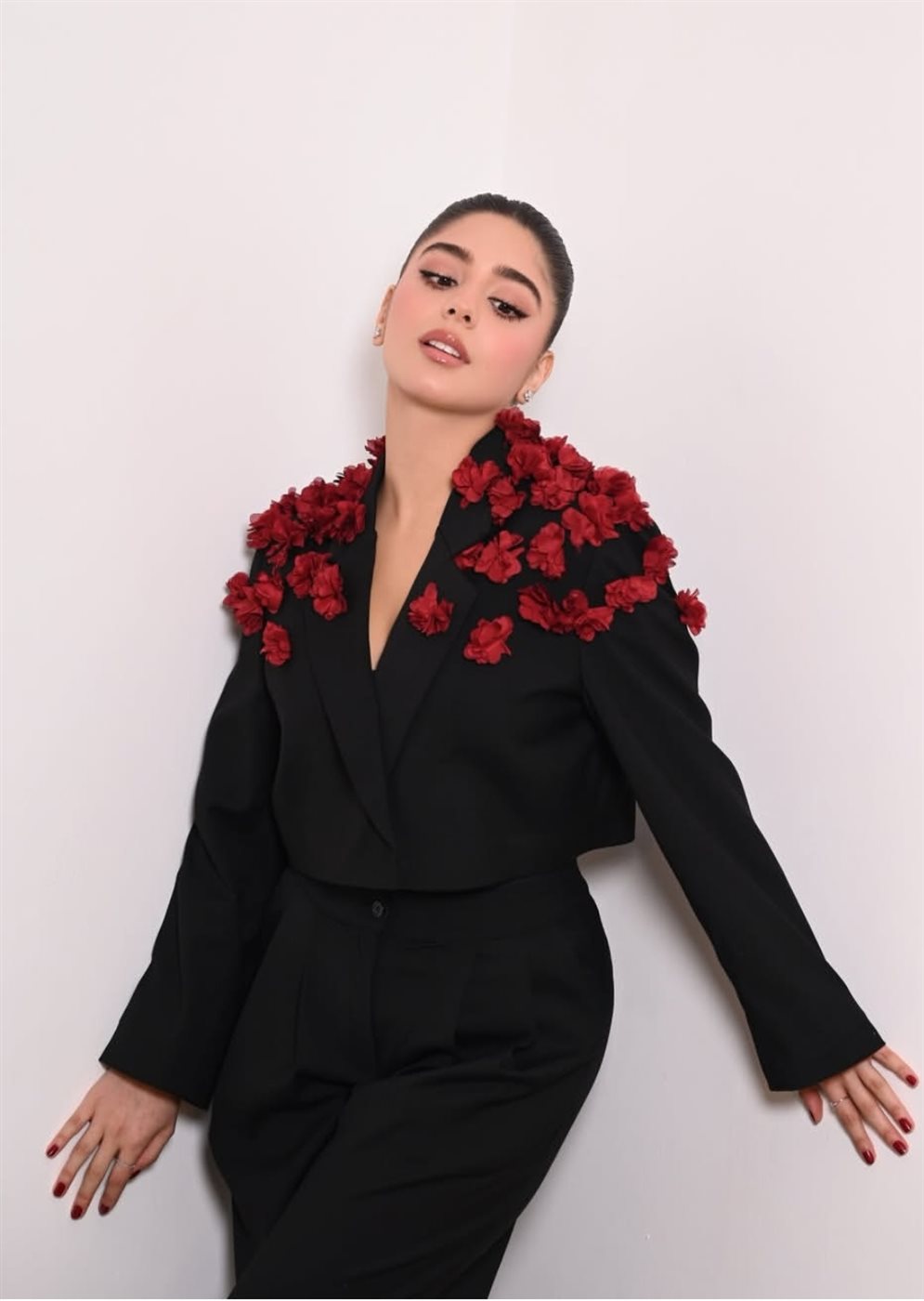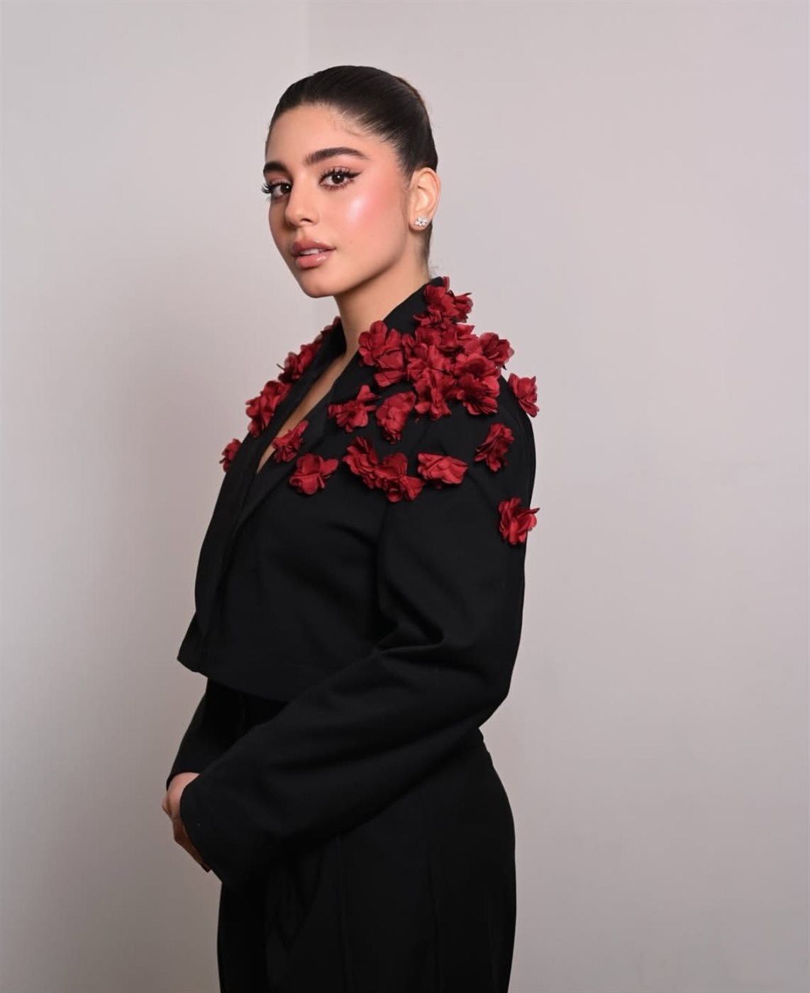 وبدت مايان السيد بإطلالة ساحرة مزينه بالزهور لتتناغم مع أسم شخصيتها التي تجسدها داخل الفيلم، وارتدت بدله سوداء مزينه بالزهور الحمراء من أعلى، الاطلالة عكست أهتمامها بمواكبة أحدث صيحات الموضة لهذا الموسم.