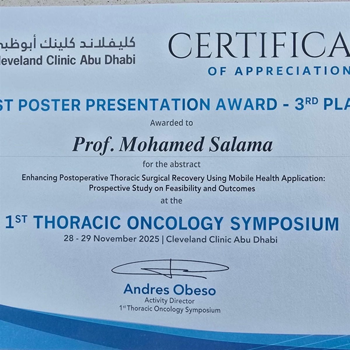 شهدت فعاليات مؤتمر كليفلاند كلينك أبوظبي لجراحة أورام الصدر، بمشاركة نخبة من كبار الجراحين والباحثين من مختلف الدول، وفي حضور علمي متميز، حقق الطبيب المصري الدكتور محمد سلامة، رئيس الجمعية الطبية المصرية بالنمسا ونائب رئيس قسم جراحة الصدر بمستشفى فلوريدزدورف في فيينا، إنجازا بارزا بحصوله على جائزة أفضل عرض بحثي – المركز الثالث.