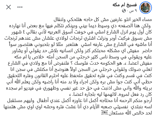 نشرت صانعة المحتوى الشهيرة بـ"أم مكة" أول تعليق لها عبر صفحتها على فيسبوك بعد الإفراج عنها، في رسالة مطولة كشفت فيها عن مشاعرها خلال أول يوم تخرج فيه للشارع بمفردها منذ بداية أزمتها، مؤكدة أنها تمر بحالة نفسية صعبة بعد فترة التحقيق التي امتدت لأربعة أشهر.
