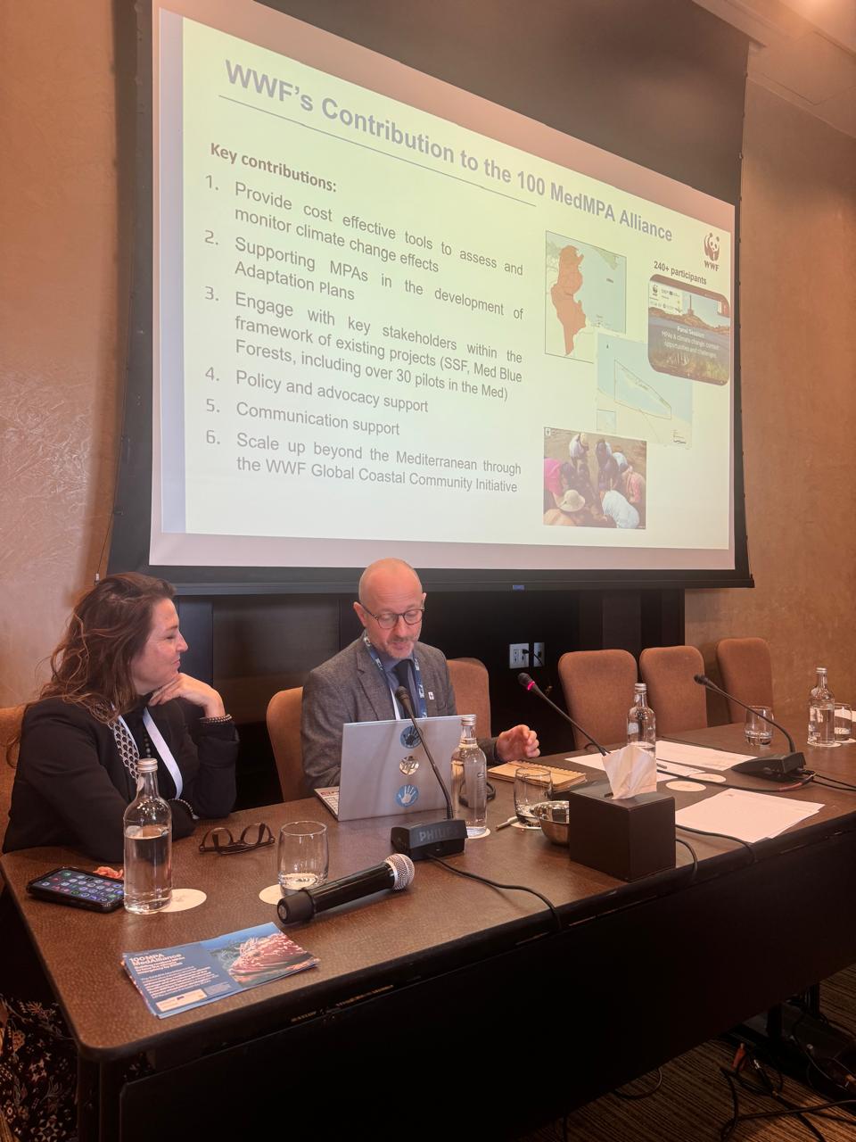 وتم أيضًا عقد جلسة جانبية تحت عنوان " تحالف ١٠٠ مليون منطقة بحرية متوسطية لمواجهة الطوارئ المناخية " برئاسة السيدة كارول مارتينيز مدير السياسات بمؤسسة ميديان ، التي اشارت إلى مجموعة أدوات جاهزة للاستخدام لتوجيه المناطق البحرية المحمية في نشر خطط عمل التكيف، وذلك من خلال الركائز الثلاث الرئيسية: آلية مخصصة مع قائمة من الخبراء للمساعدة طويلة الأجل في المساعدة على التكييف، دعم المناطق البحرية المحمية في تطوير خطط التكيف، وأخيرا" مساهمة الصندوق العالمي للطبيعة في تحالف الـ 100 منطقة بحرية متوسطية، وأكدت ضرورة توافر أدوات فعالة لتقييم ومراقبة آثار تغير المناخ، والتواصل مع أصحاب المصلحة الرئيسيين في إطار المشاريع القائمة (الغابات الساحلية الصغيرة، والغابات الزرقاء المتوسطية، بما في ذلك أكثر من 30 مشروعًا تجريبيًا في البحر الأبيض المتوسط) لمواجهة مخاطر تغير المناخ على المناطق البحرية.