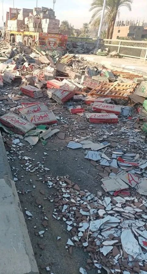 وجار في الوقت الحالي رفع حمولات السيراميك من نهر الطريق وإعادة الشاحنة إلى وضعها الطبيعي، تمهيدا لفتح الطريق أمام حركة المواطنين واستعادة السيولة المرورية.