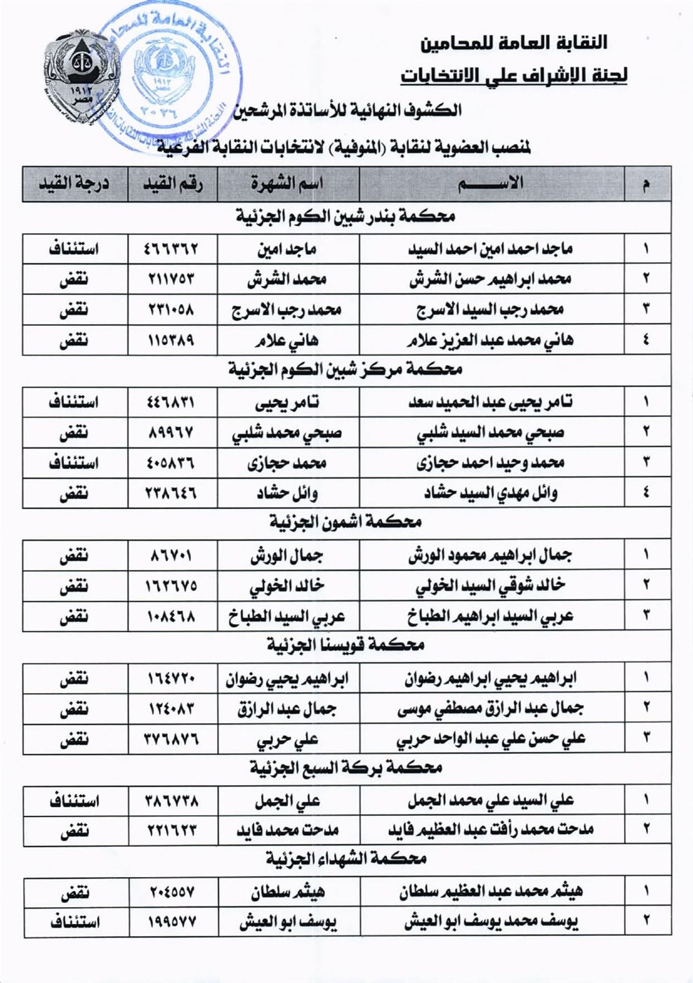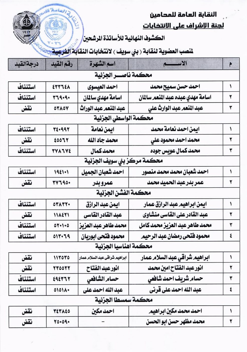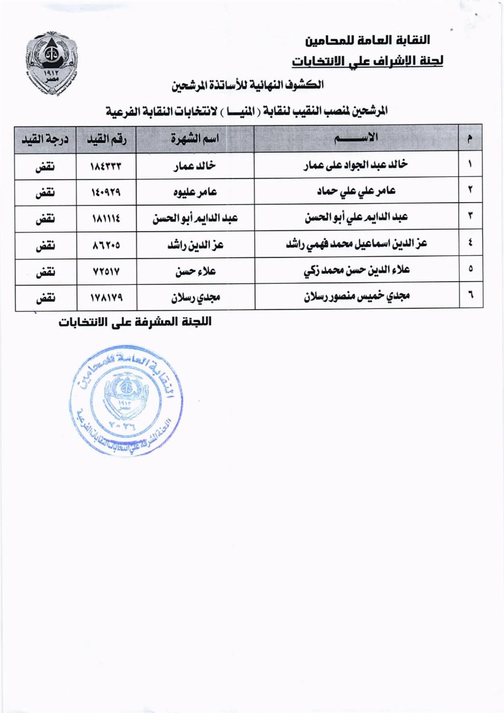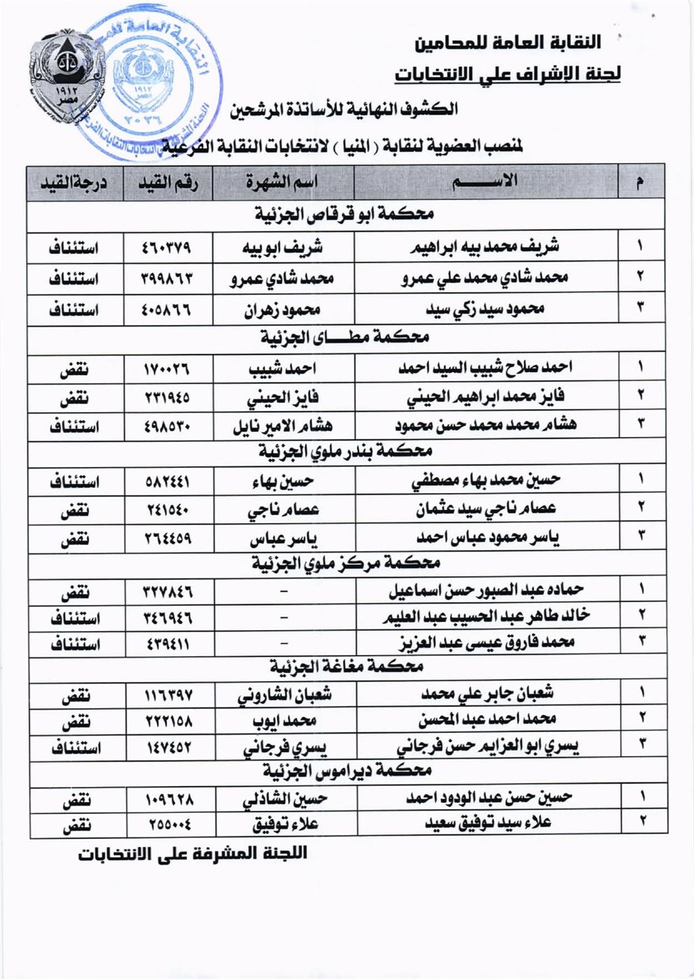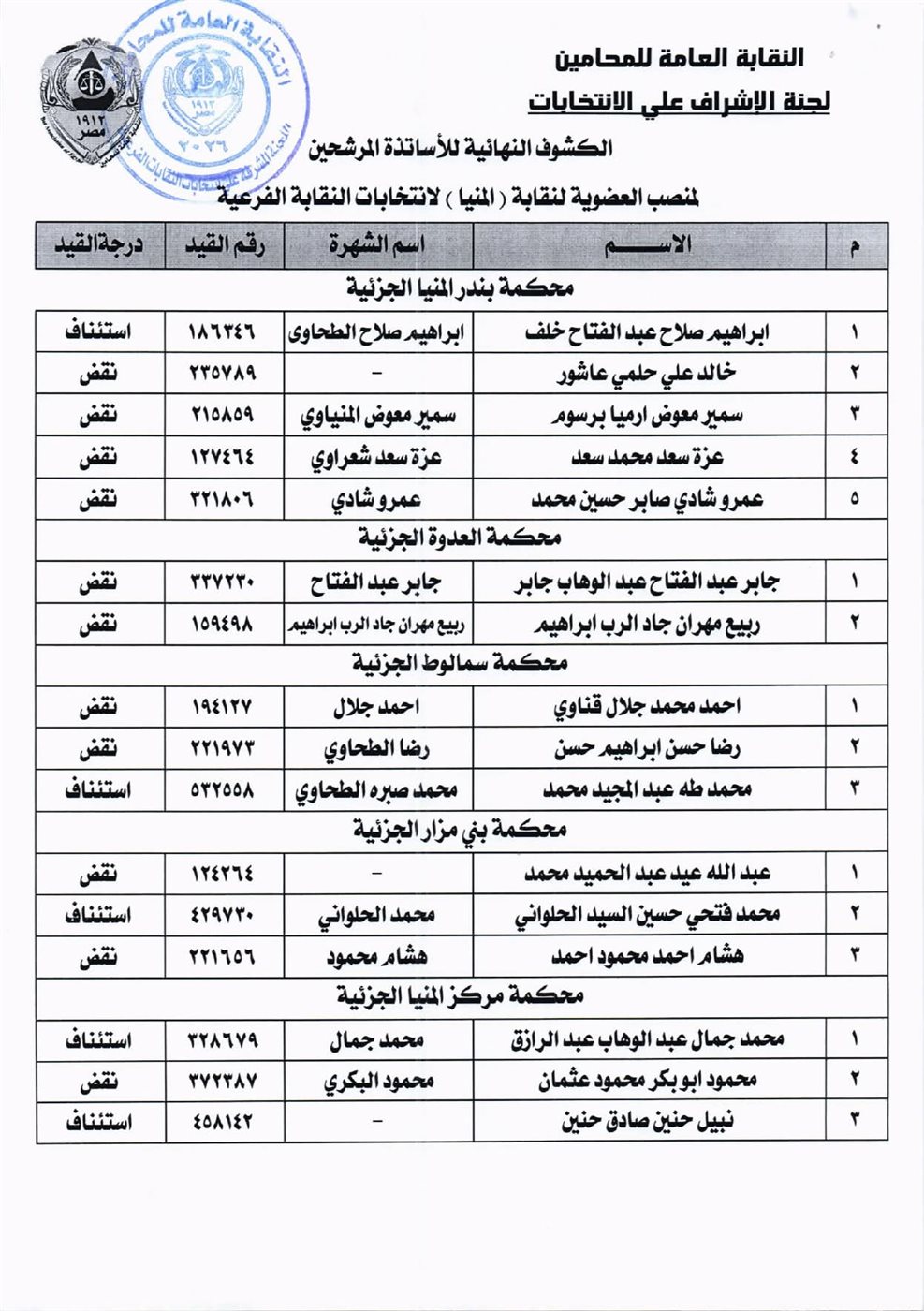 وبذلك ووفقا للحصر العددي النهائي للسادة المرشحين للمرحلة الأولى فقد تم اعداد الكشوف النهائية بأسماء السادة المرشحين وفقا للمرفق الاتى: -