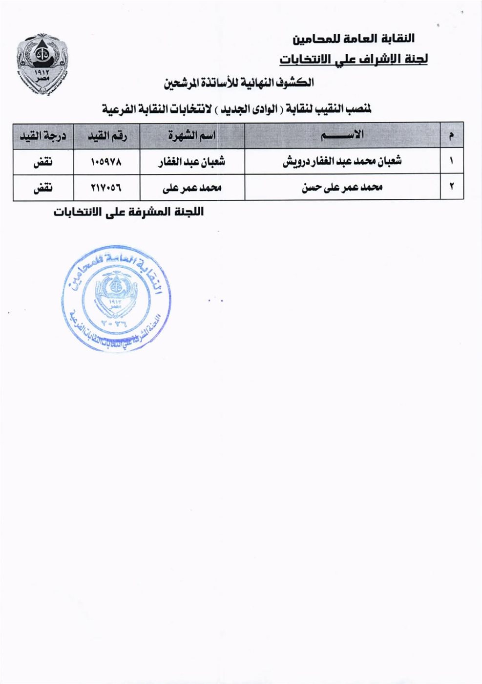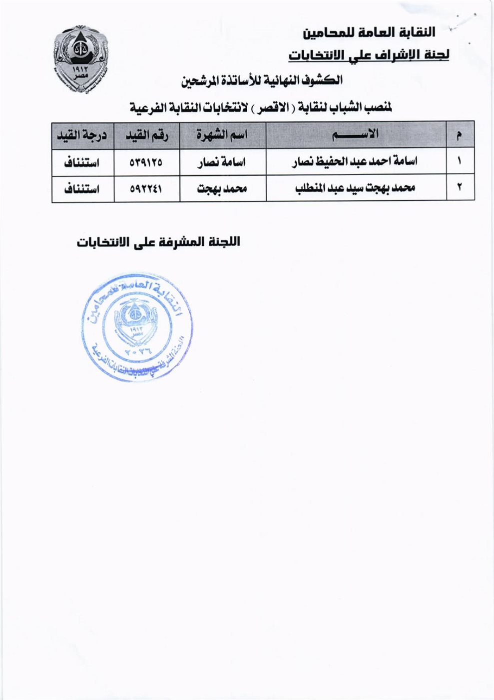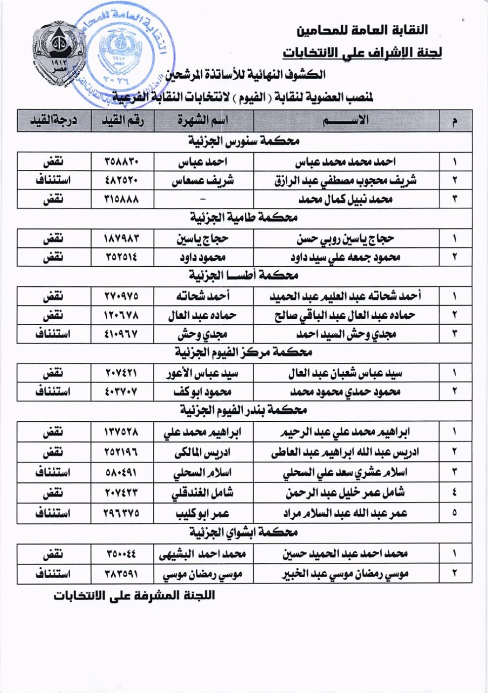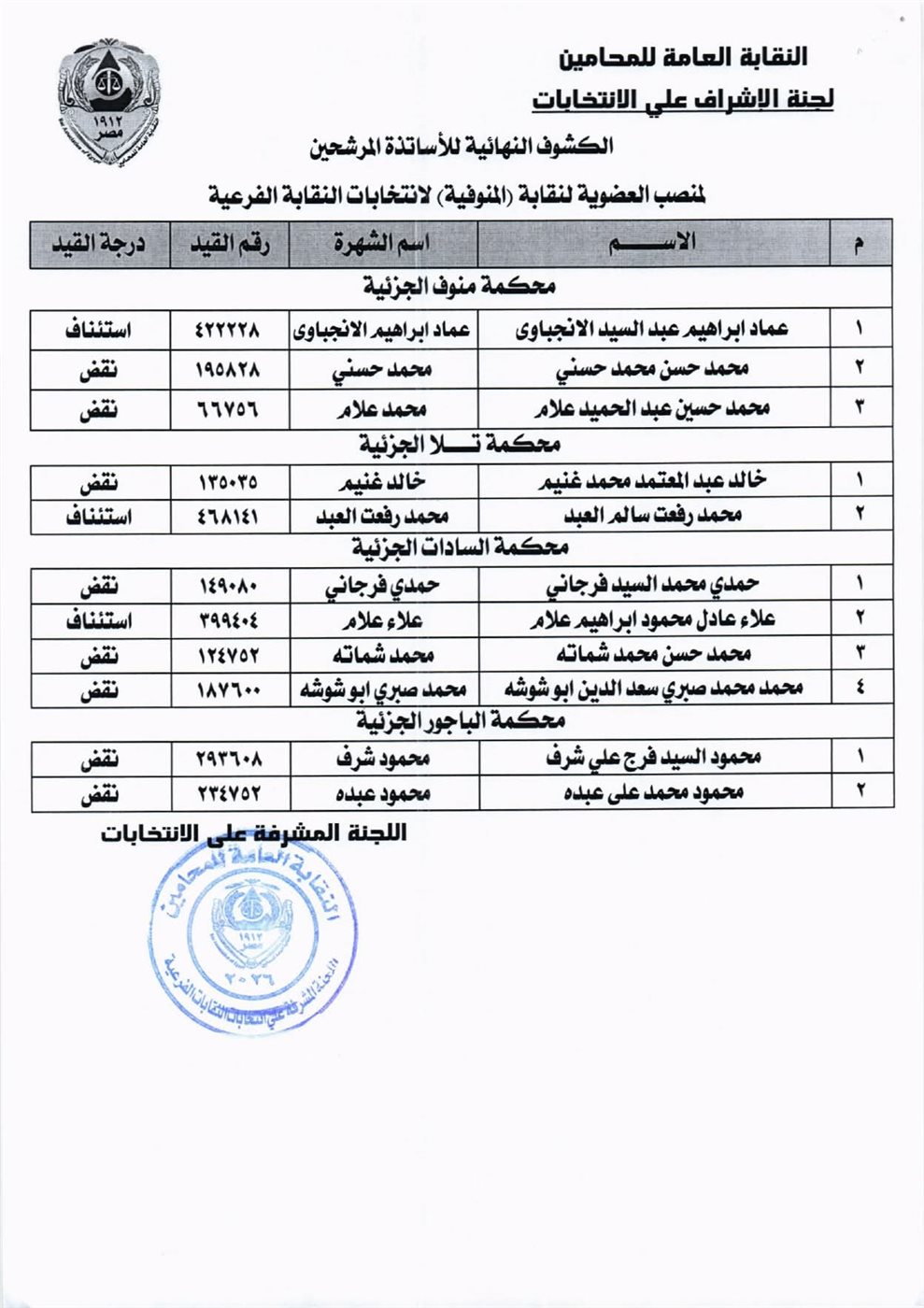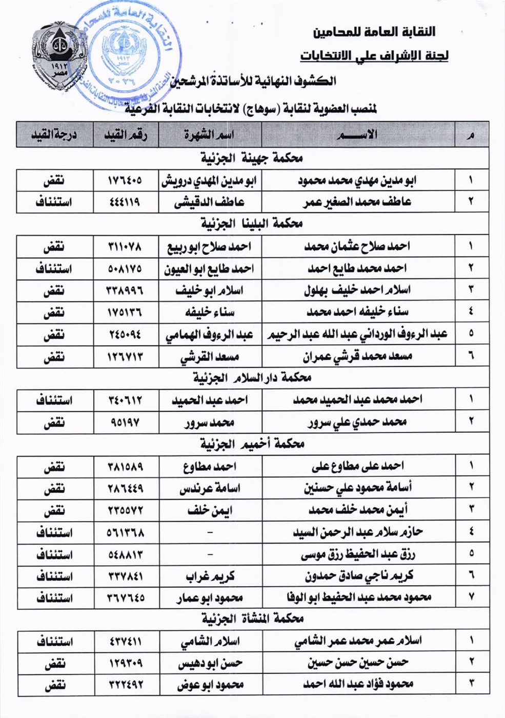 وبذلك ووفقا للحصر العددي النهائي للسادة المرشحين للمرحلة الأولى فقد تم اعداد الكشوف النهائية بأسماء السادة المرشحين وفقا للمرفق الاتى: -