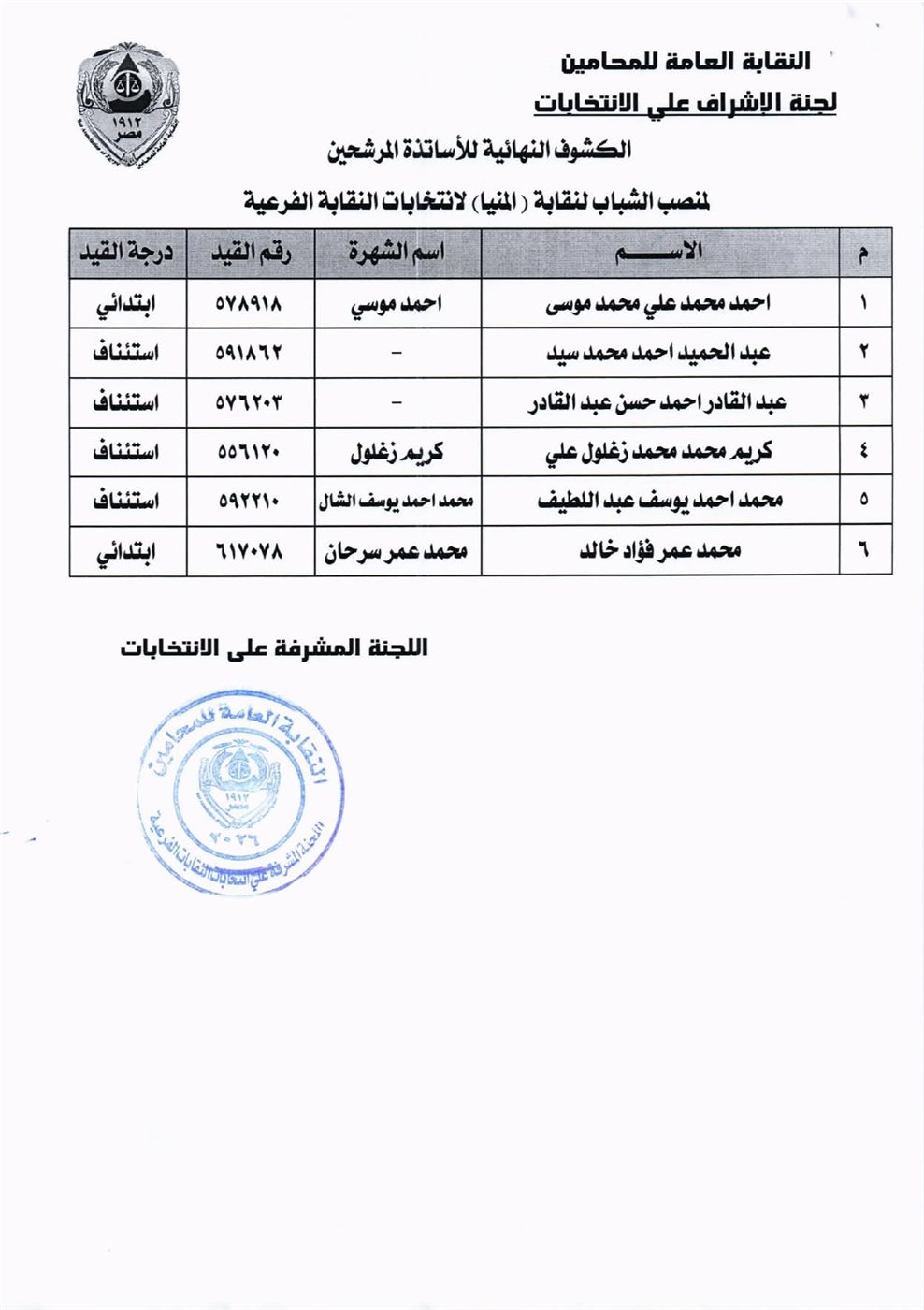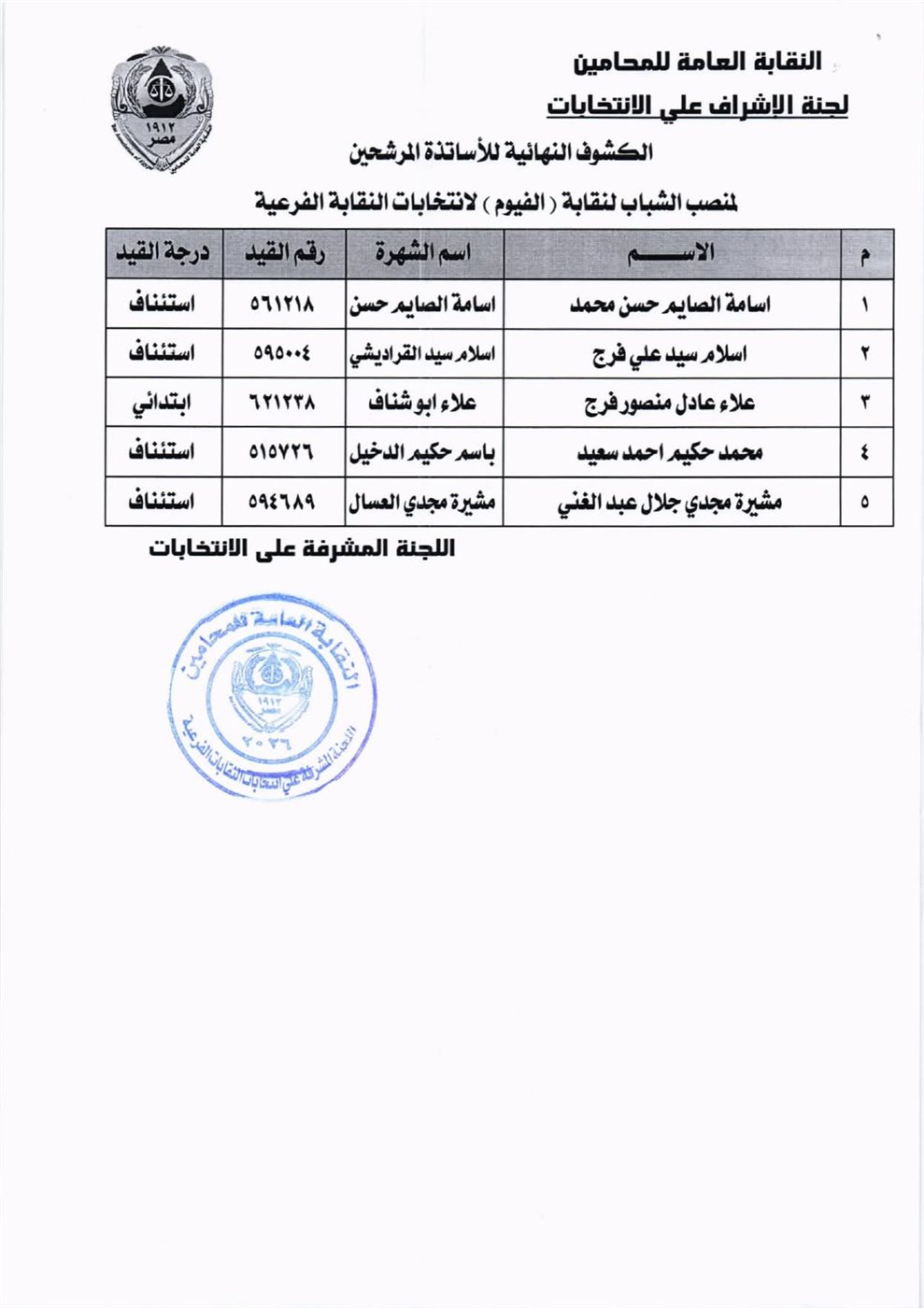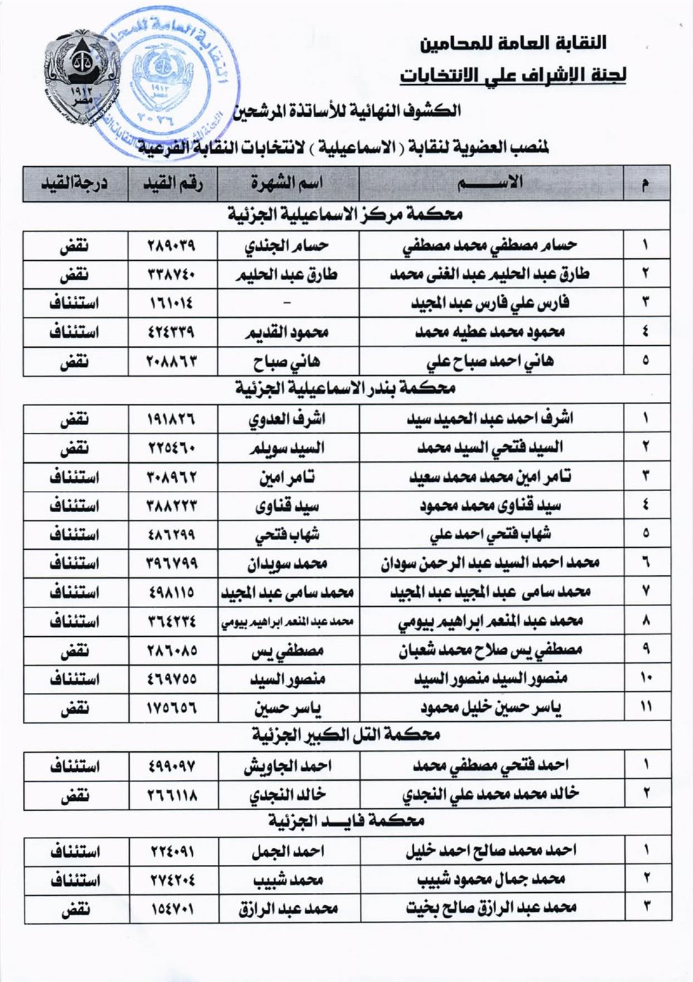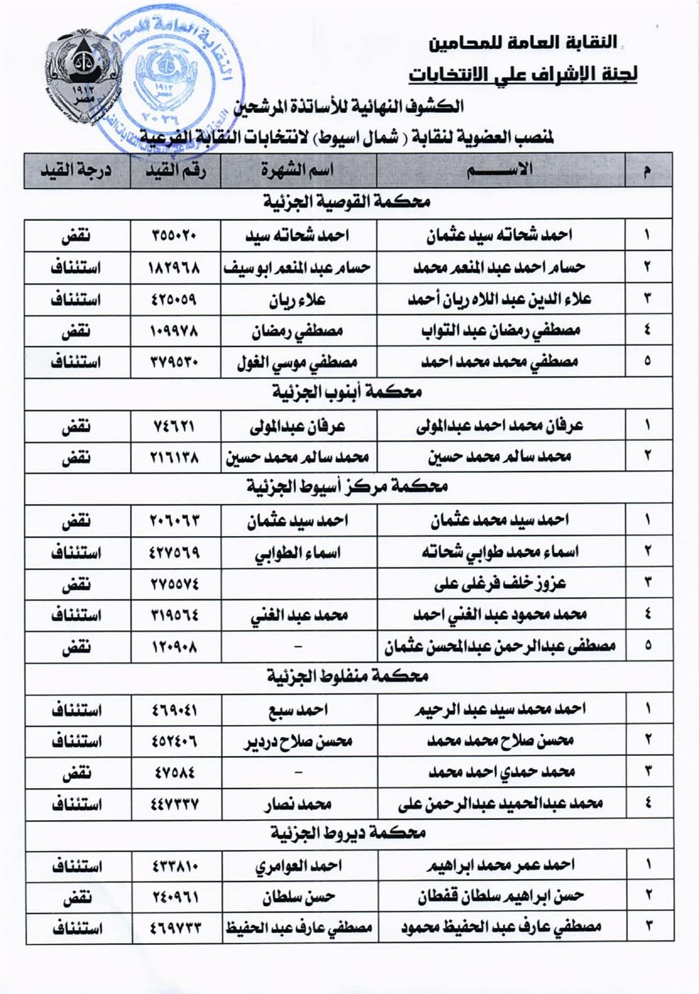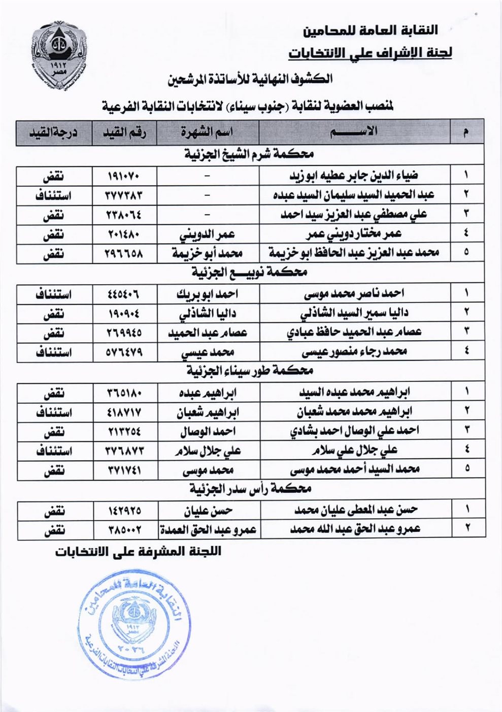وبذلك ووفقا للحصر العددي النهائي للسادة المرشحين للمرحلة الأولى فقد تم اعداد الكشوف النهائية بأسماء السادة المرشحين وفقا للمرفق الاتى: -