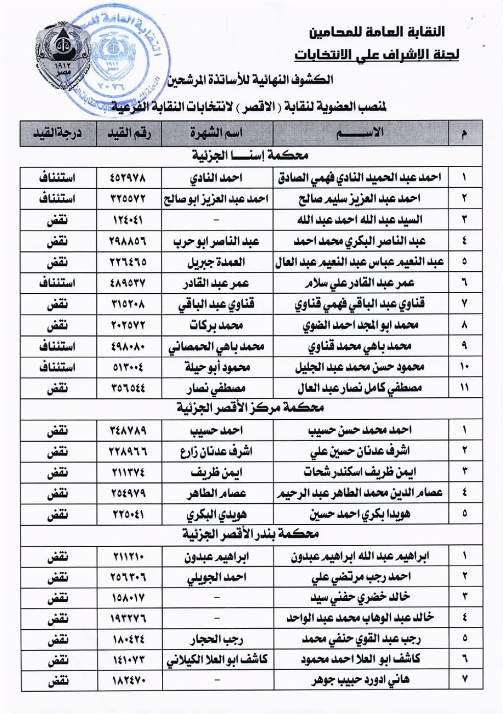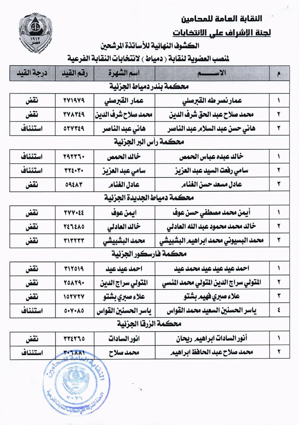 بالأسماء.. نقابة المحامين تعلن الكشوف النهائية للمرشحين في المرحلة الأولى من انتخابات النقابات الفرعية