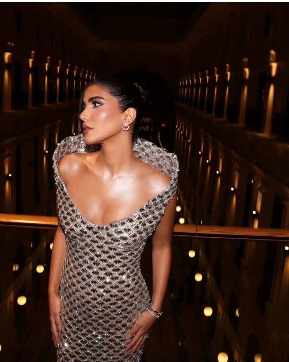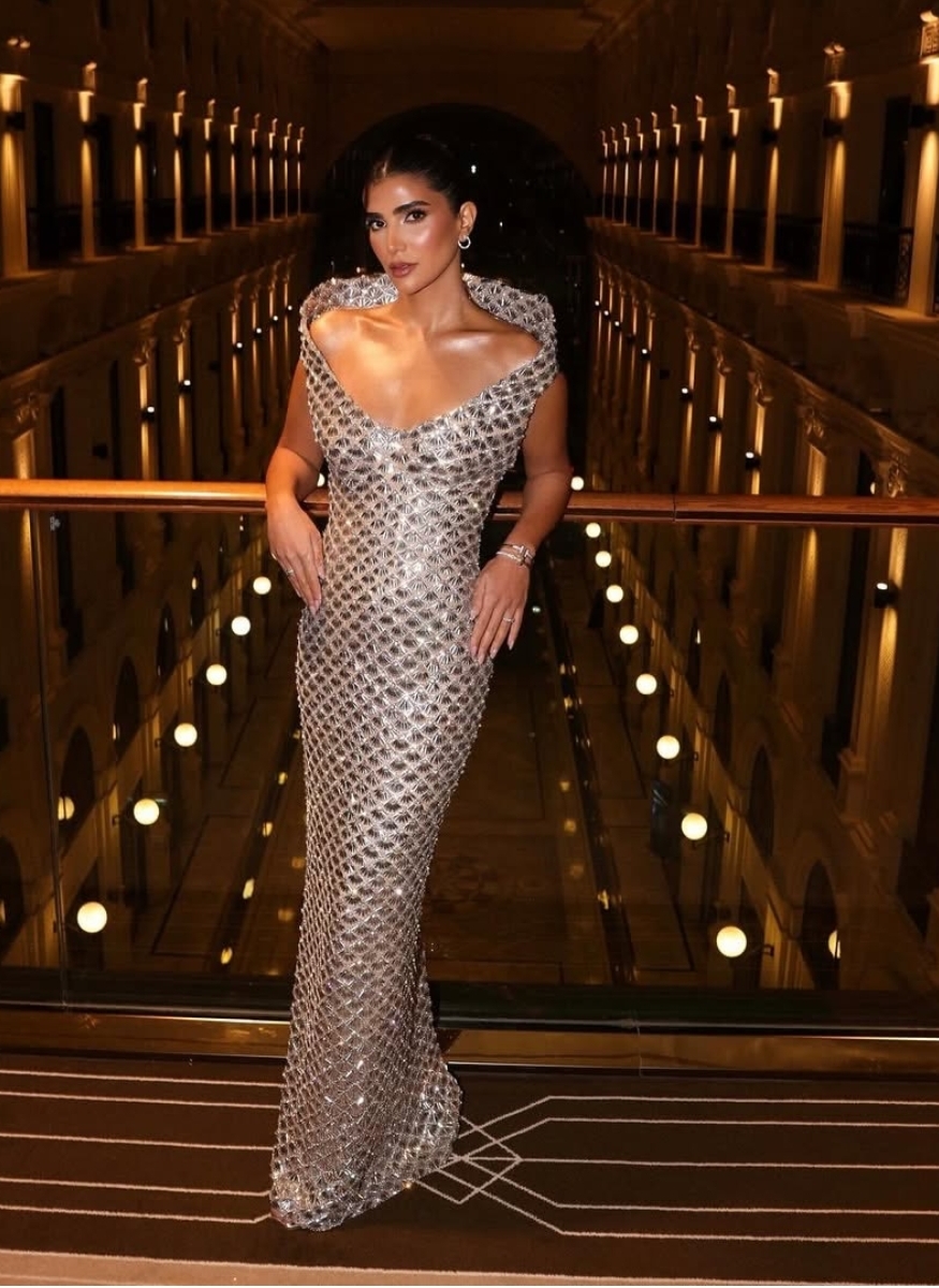 وبدت ريم سامي بإطلالة ساحرة، مرتديه فستان طويل مجسم، ينتمي لقصة الرقبة المكشوف، ينتمي تصميم الفستان لاحدث تصاميم فساتين السهرة 2025.2026، صمم من قماش ناعم وطرز بشكل دقيق لتبدو مثل عارضات الأزياء العالميات مما جعلها تخطف الأنظار لجمالها.