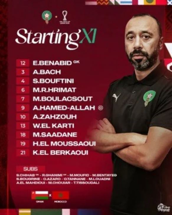 أعلن طارق السكتيوي، المدير الفني لـ منتخب المغرب، عن تشكيل أسود الأطلسي لمواجهة نظيره العماني اليوم الجمعة، على ملعب استاد المدينة التعليمية في العاصمة القطرية الدوحة، ضمن منافسات الجولة الثانية من دور المجموعات لبطولة كأس العرب.