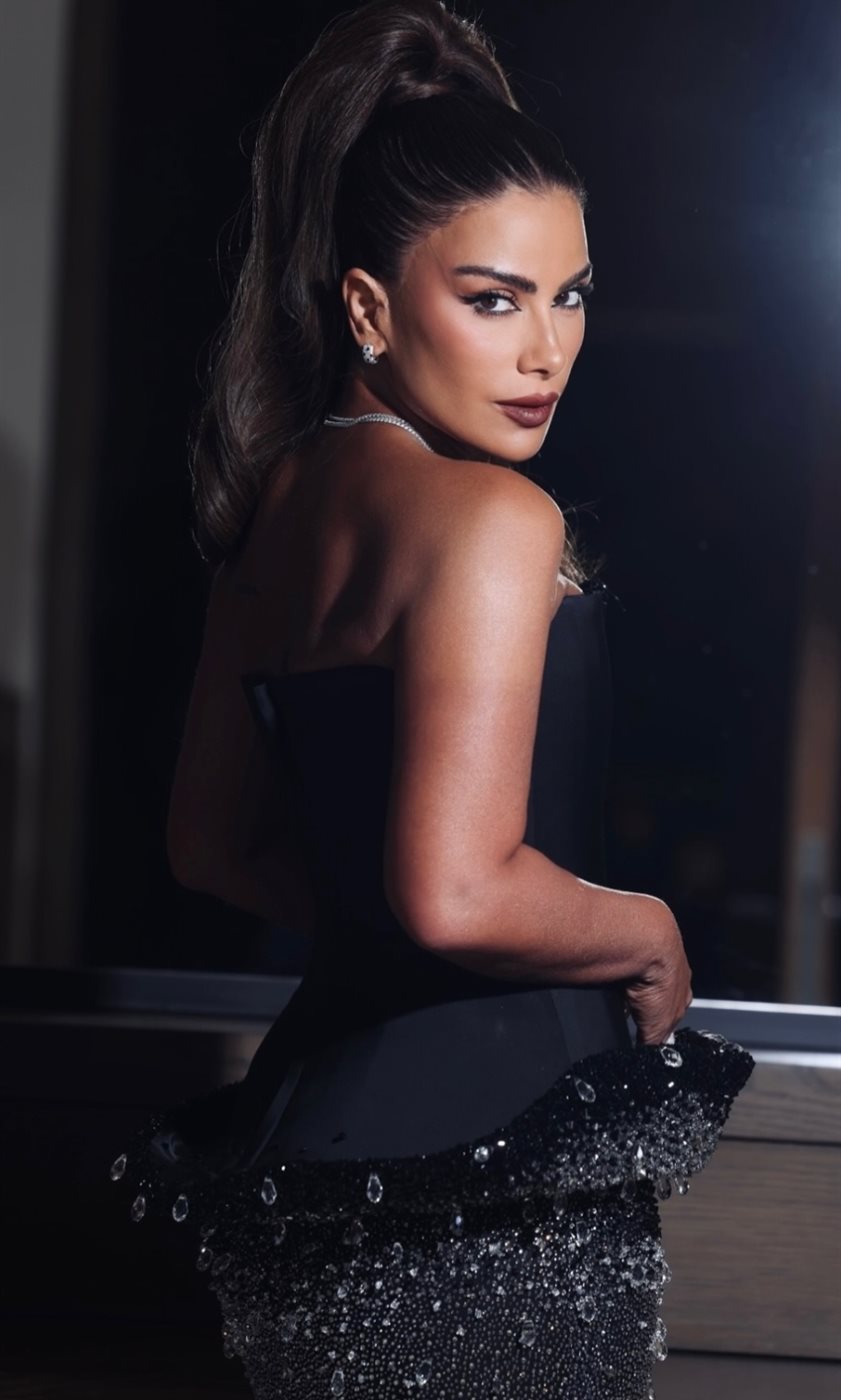 أما من الناحية الجمالية، وتولت خبيرة التجميل منة ثابت تنفيذ مكياجها، مستخدمة مستحضرات ماك كوزميتكس الشرق الأوسط (MAC Cosmetics Middle East)، حيث ركزت على مكياج عيون سموكي جذاب مع سحبة عين حادة ورموش كثيفة، بينما جاءت الشفاه بلون بني داكن ليمنح الإطلالة طابعاً درامياً قوياً يتناسب مع فستانها الأسود