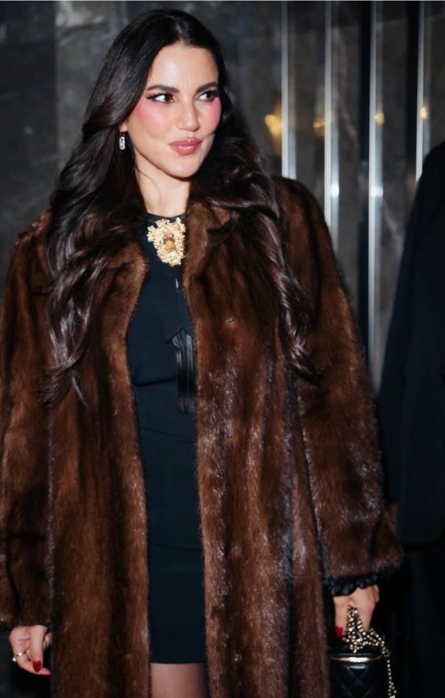 وبدت درة بإطلالة عصرية، مرتديه فستان قصير مجسم صمم من قماش الكريب اللون الأسود ونسقت عليه بالطو فرو لتزيد من فخامة إطلالتها.