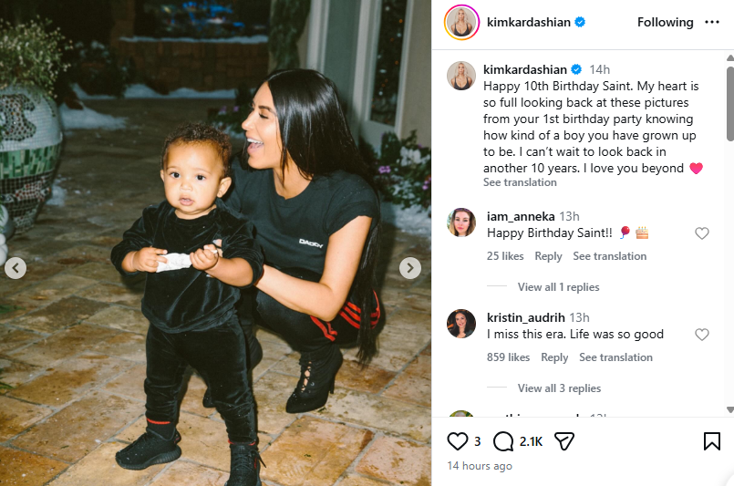 نشرت كيم كارداشيان، مؤسسة شركة SKIMS ونجمة تلفزيون الواقع، رسالة عاطفية بمناسبة عيد ميلاد ابنها سانت العاشر، مظهرة جانبها الحنون كأم رغم جدول أعمالها المزدحم.