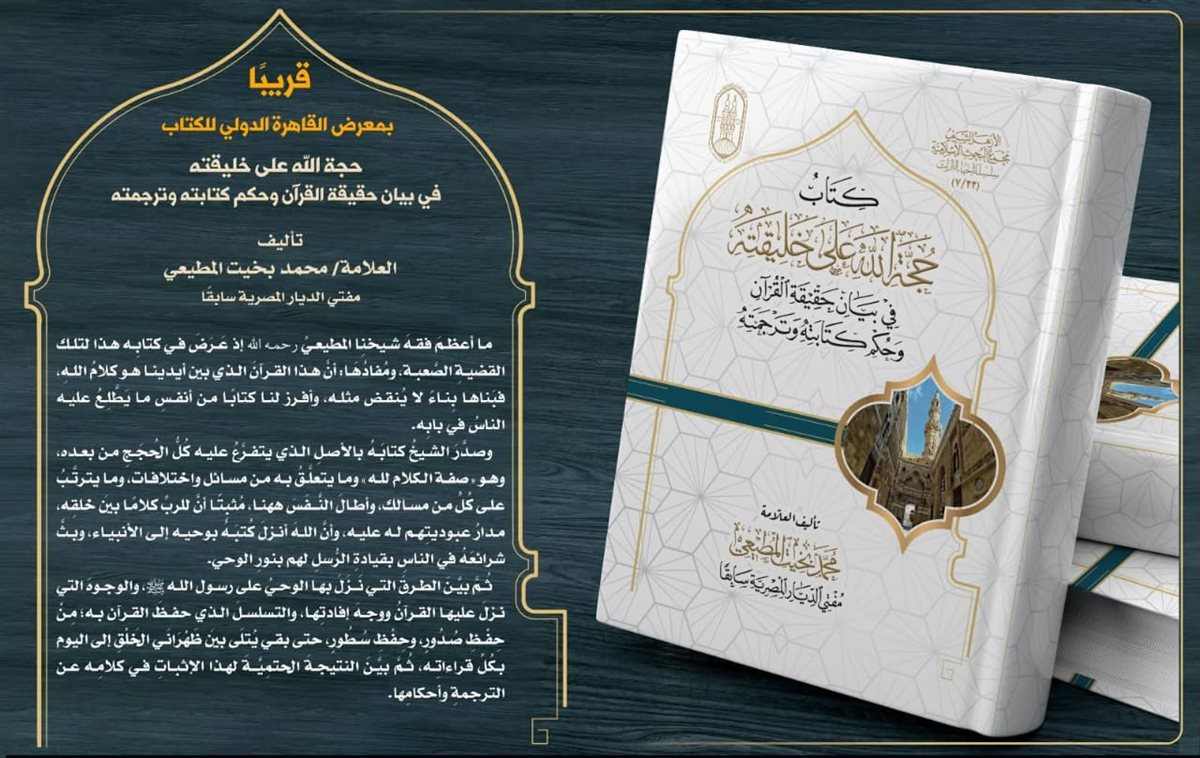 أفاد مجمع البحوث الإسلامية أنّه قريبًا، وفي إطار فعاليات معرِض القاهرة الدولي للكتاب، سيُعاد طرح كتاب «حُجَّة الله على خليقته» لعلم الأمة محمد بخيت المطيعي — مفتي الديار المصرية سابقًا — والذي يناقش فيه قضية مركزية: أن القرآن الكريم الذي بين أيدينا ليس تأليف بشر، بل هو كلام الله تعالى، مبني على أدلة لغوية، عقائدية، وأسانيد شرعية رصينة.