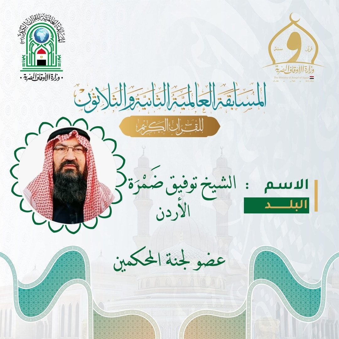 أعلنت وزارة الأوقاف أسماء أعضاء لجنة المحكمين لمسابقة القرآن الكريم، ومن بين أبرز الأعضاء فضيلة الشيخ توفيق إبراهيم أحمد ضَمْرَة، إمام وخطيب مسجد العروة الوثقى في رأس العين بالعاصمة الأردنية عمّان.