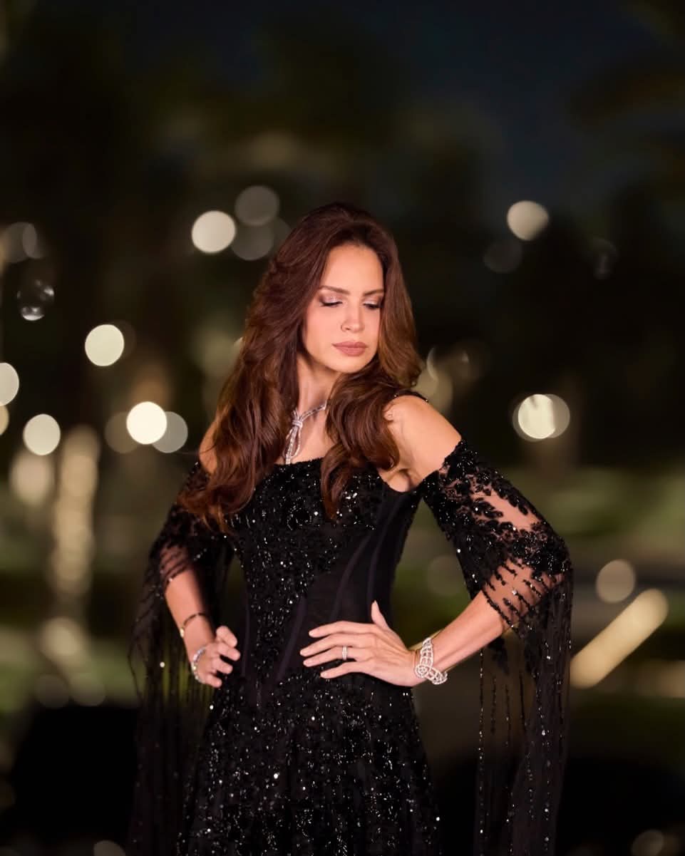 وبدت آمال ماهر بإطلالة ساحرة، مزجت بين الأناقه والجاذبية في آن واحد، مرتديه فستان طويل مجسم، صمم من الحرير باللون الأسود وزين بالخرز الراقي الفستان حمل توقيع مصمم الأزياء رامي سلمون، لتعكس قوامها الممشوق ووزنها المثالي.