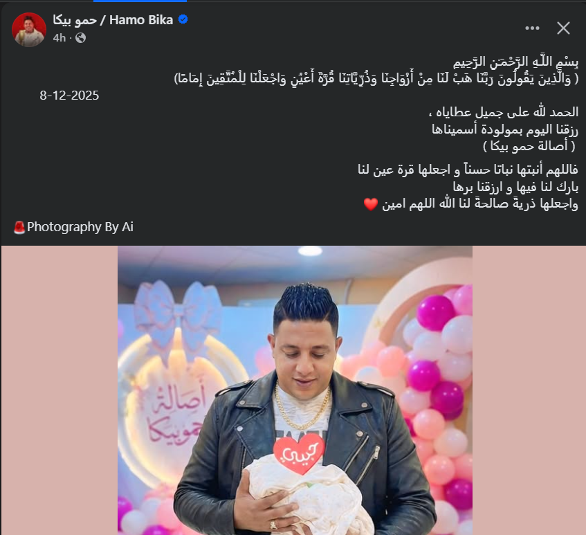 نشر حمو بيكا صورته وهو يحمل طفلته وأرفقها بتعليق قائلًا: “بِسْمِ اللَّـهِ الرَّحْمَـٰنِ الرَّحِيمِ ﴿ وَالَّذِينَ يَقُولُونَ رَبَّنَا هَبْ لَنَا مِنْ أَزْوَاجِنَا وَذُرِّيَّاتِنَا قُرَّةَ أَعْيُنٍ وَاجْعَلْنَا لِلْمُتَّقِينَ إِمَامًا﴾ 8-12-2025”.