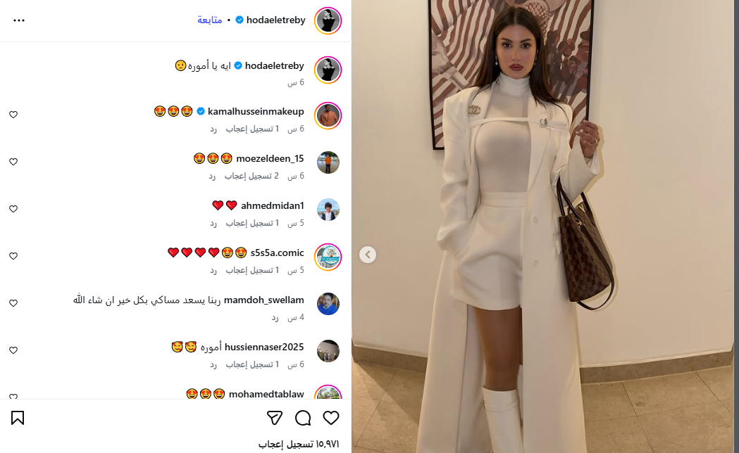 وظهرت هدى الإتربي في الصور التي نشرتها على "إنستجرام" مرتدية بالطو أبيض طويل مع بلوفر وشورت قصير، لتتلقى سيلاً من التعليقات مثل: "أمورة البنات"، "أيقونة وجميلة"، "روعة الجاكت"، "حلاوة الدنيا كلها"، و"شيك أوي".