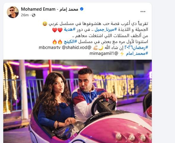 أعلن الفنان محمد إمام عبر حسابه الرسمي على فيس بوك عن انضمام الفنانة ميرنا جميل لفريق عمل مسلسله الجديد "الكينج"، المقرر عرضه ضمن سباق رمضان 2026.