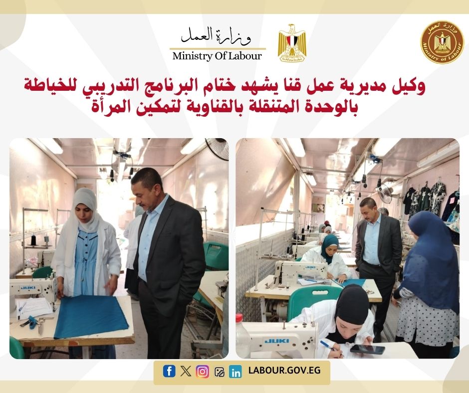 وكيل مديرية عمل قنا يشهد ختام البرنامج التدريبي للخياطة بالوحدة المتنقلة بالقناوية لتمكين المرأة